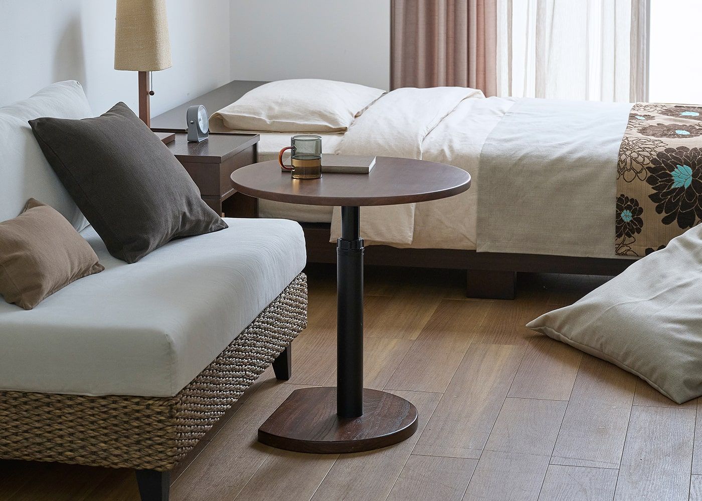 昇降機能はそのままに天板幅を550mmへと広げ、よりゆとりある使い心地を実現したテン・サイドテーブル 550。無垢材の素材感と高さを調節できる便利な機能が備わった使い勝手の良さが特長。同シリーズの