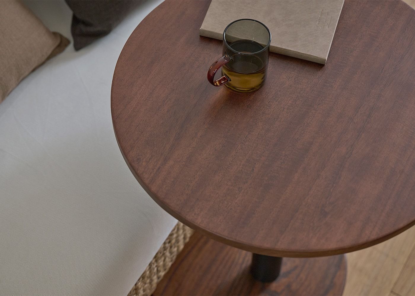 丸い天板は角がなく、やさしい印象を空間にプラス。どの角度からでも使いやすく、手元に置いたものが自然になじむので、くつろぎの時間をより心地よく演出します。
