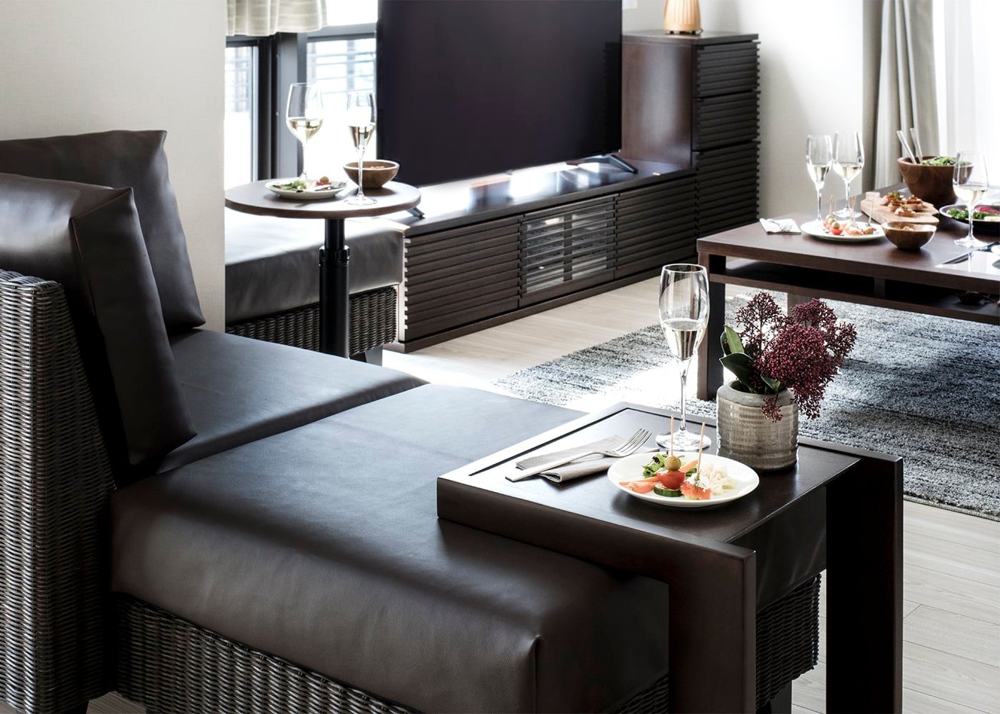 ゲストとの食事を楽しみたい時などにテーブルが少ない場合は、ソファやオットマンに差し込むことで食事スペースを確保できます。過ごし方に合わせて、ケイ・サイドテーブルのレイアウトを気軽に変えてみましょう。