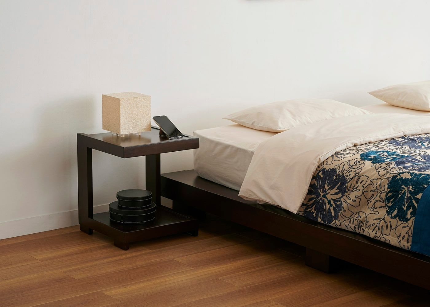 ベッド横のサイドテーブルとしても利用可能です。ライフスタイルに合わせて、リビングから寝室までマルチに活躍してくれます。開放的な低いベッドとも好相性でロースタイルな寝室を楽しめるでしょう。(写真は