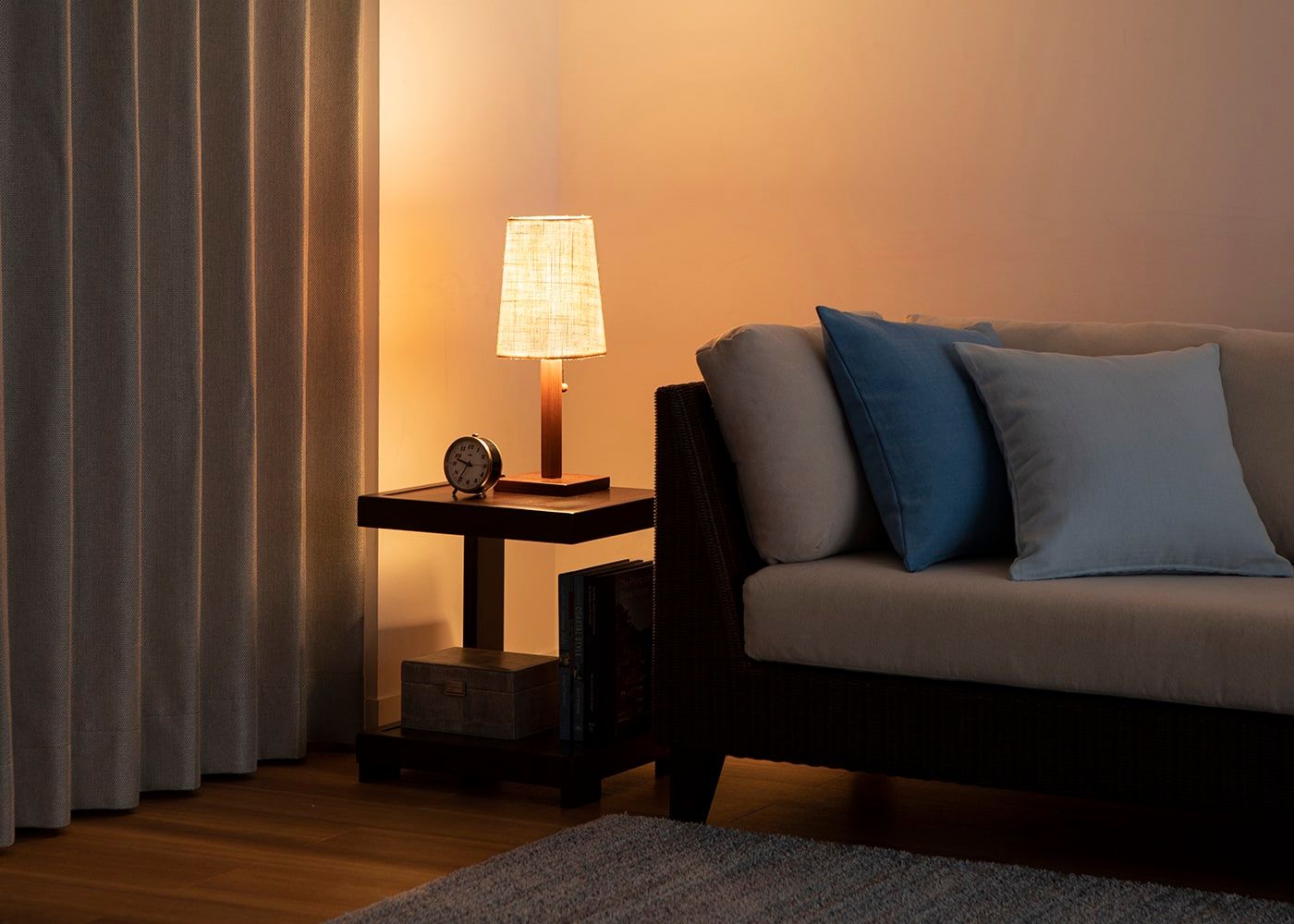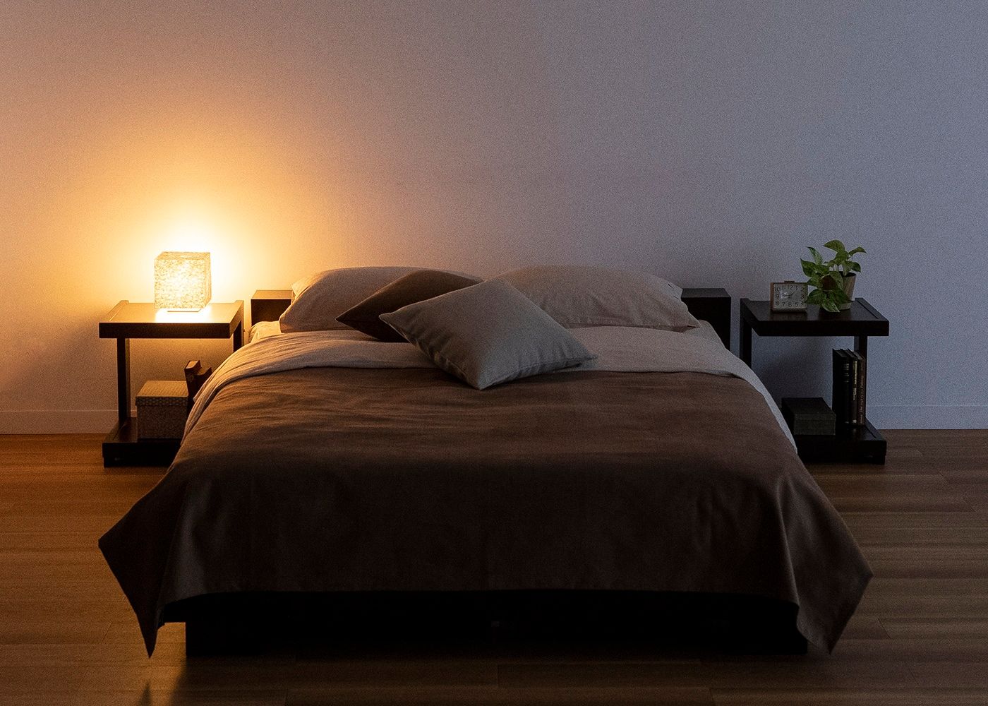 ケイ・サイドテーブルのコの字デザインを活かして、キューブ型の間接照明を添えてみましょう。和モダンなホテル風の寝室コーディネートを楽しむことも可能です。(写真は