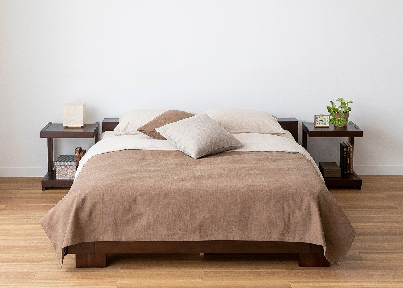 ロータイプのツインベッド中央に置けば、2人で一緒に使えるベッドサイドテーブルに。高さが近いため、テーブルを置くことでベッド周りがすっきりとした印象になります。