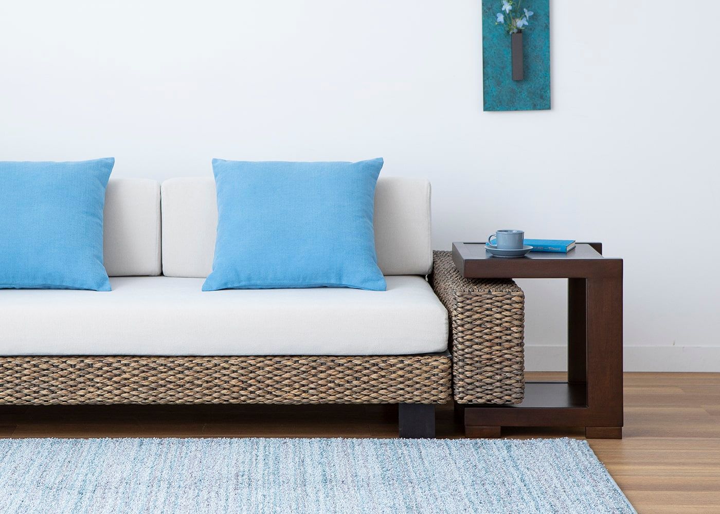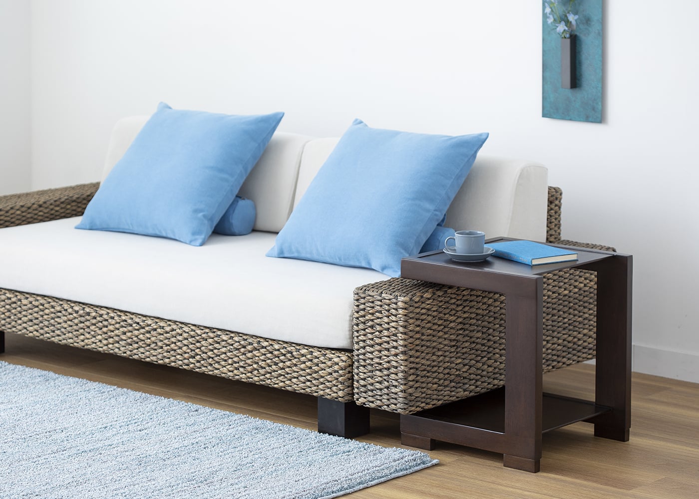 ソファのアーム側から手前に移動させて、座面側に差し込んで使うこともできます。天板と棚板を薄く見せるディテールによって、空間に開放感をもたらします。