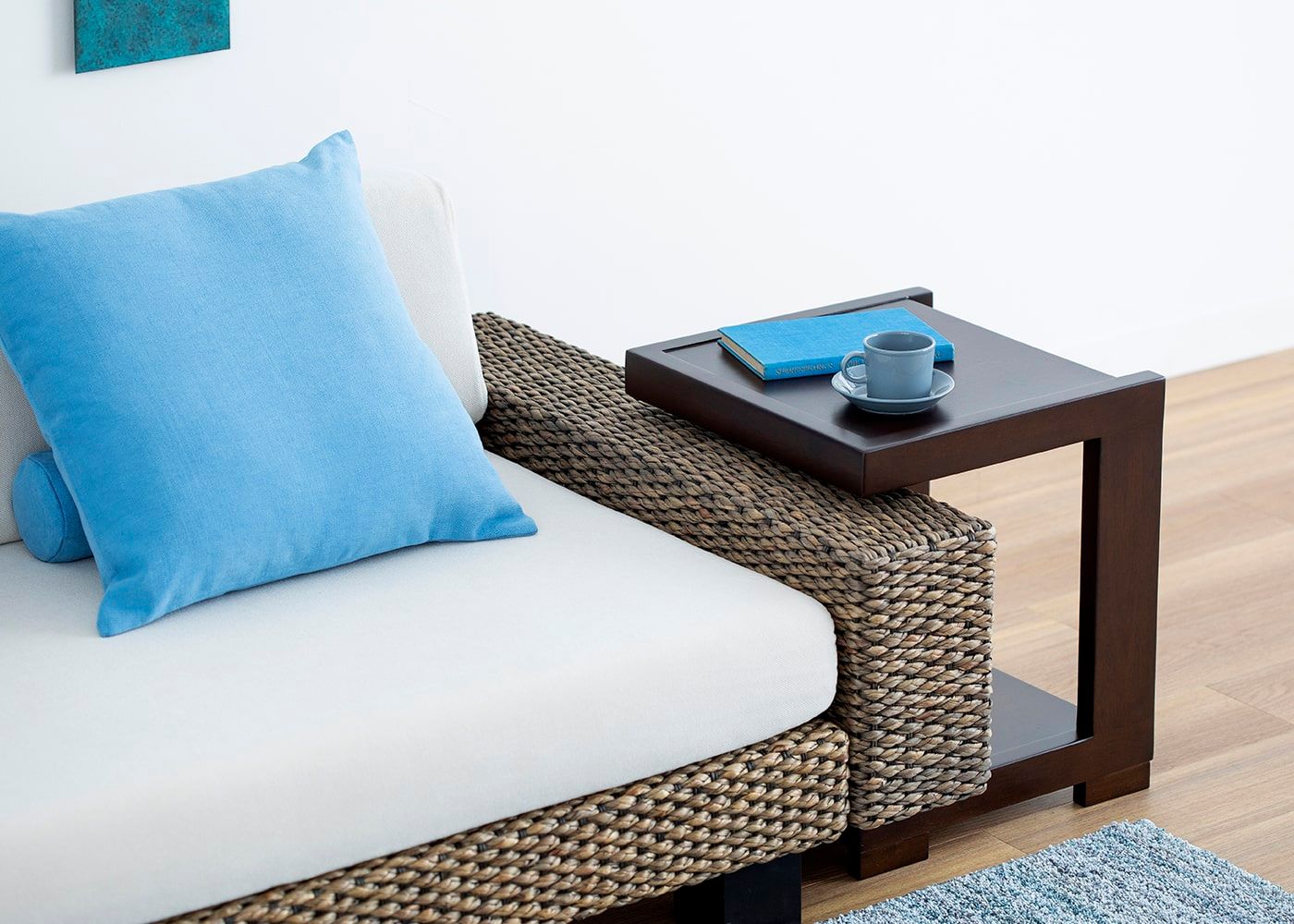 ケイ・サイドテーブルは別シリーズのソファの座面にも差し込んで使える便利なテーブルです。(写真は