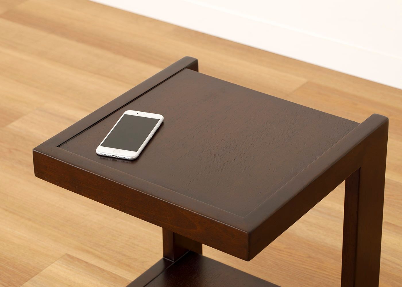 天板に縁を設けることで、スマホやコップなどの置いた物が落ちにくいよう、安全面に配慮したサイドテーブルです。