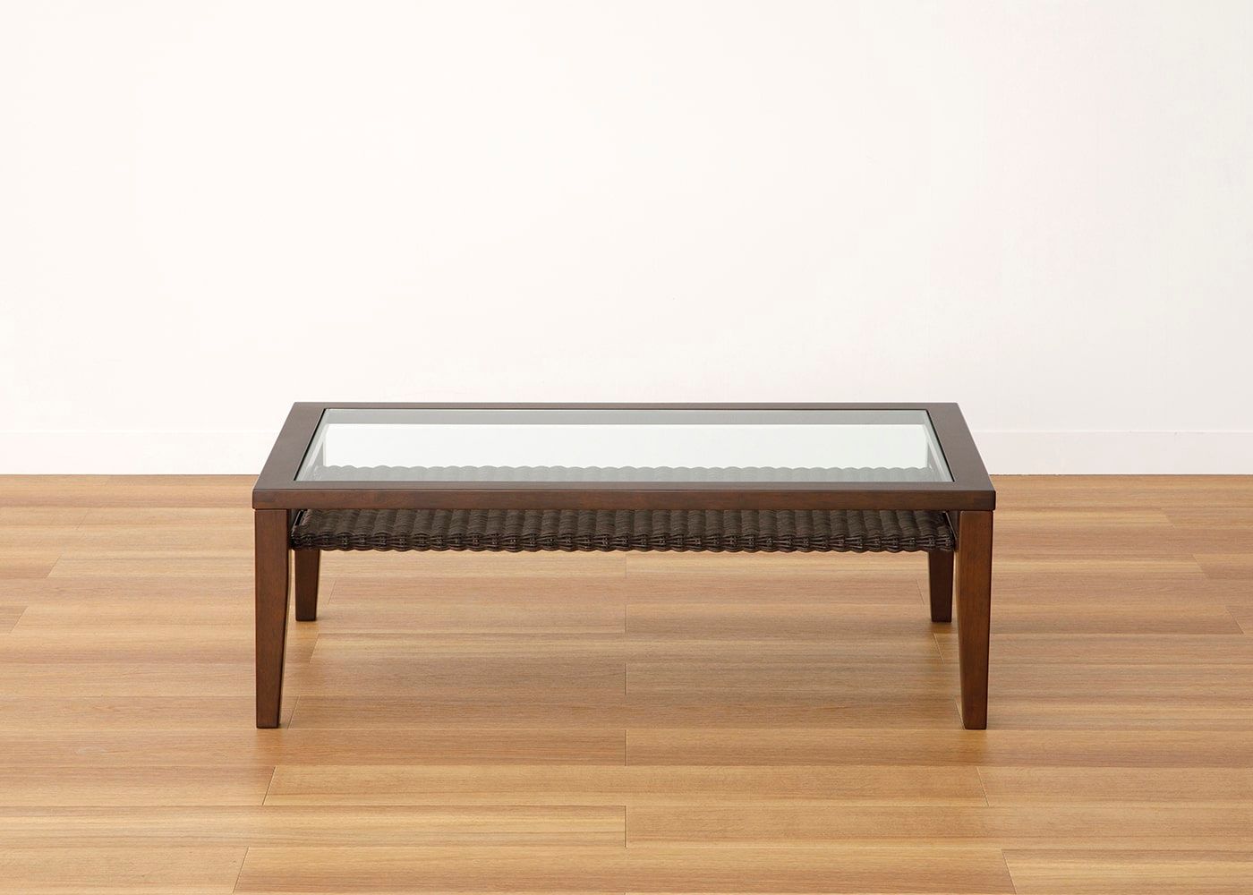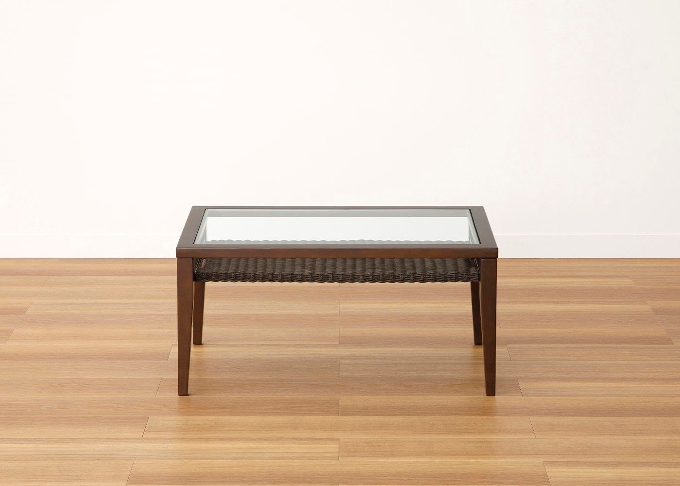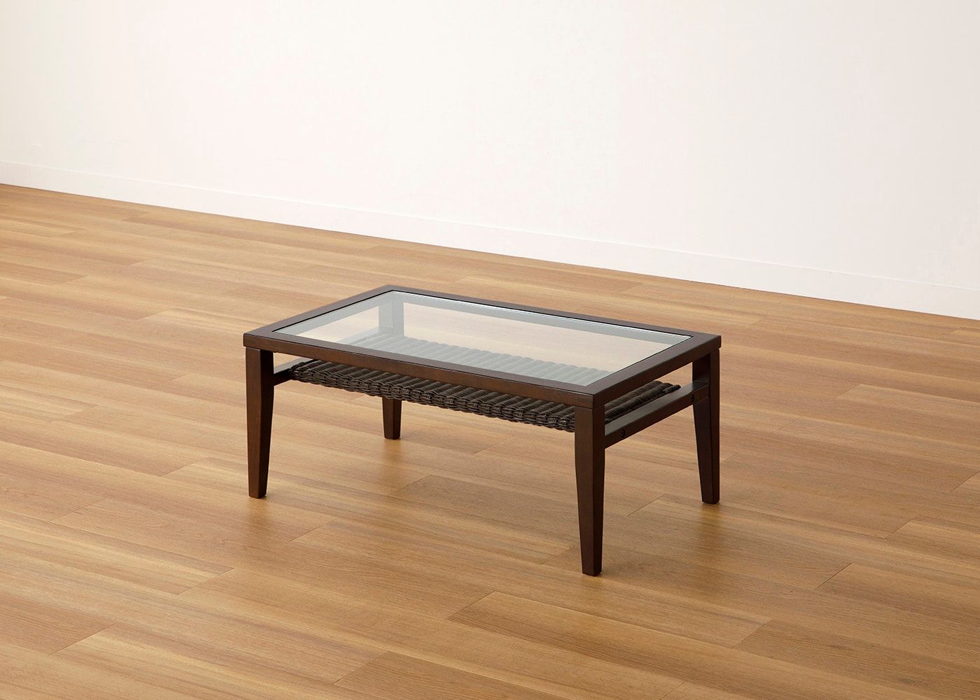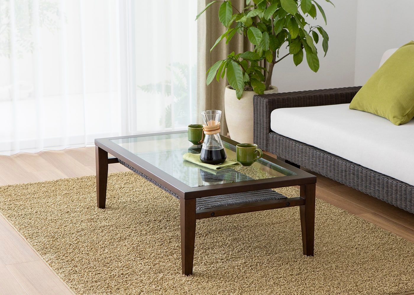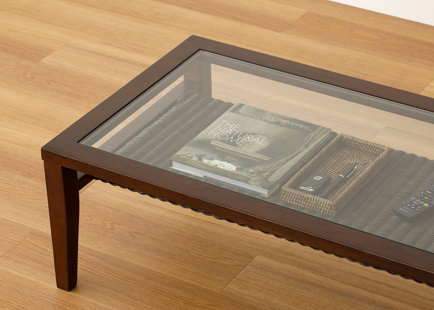 涼しげなガラスと繊細なラタンの組み合わせが、素材の温もりとリゾートのような爽やかさを感じさせるケイ・ローテーブル (ラタン)。