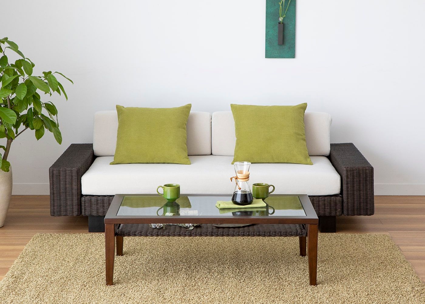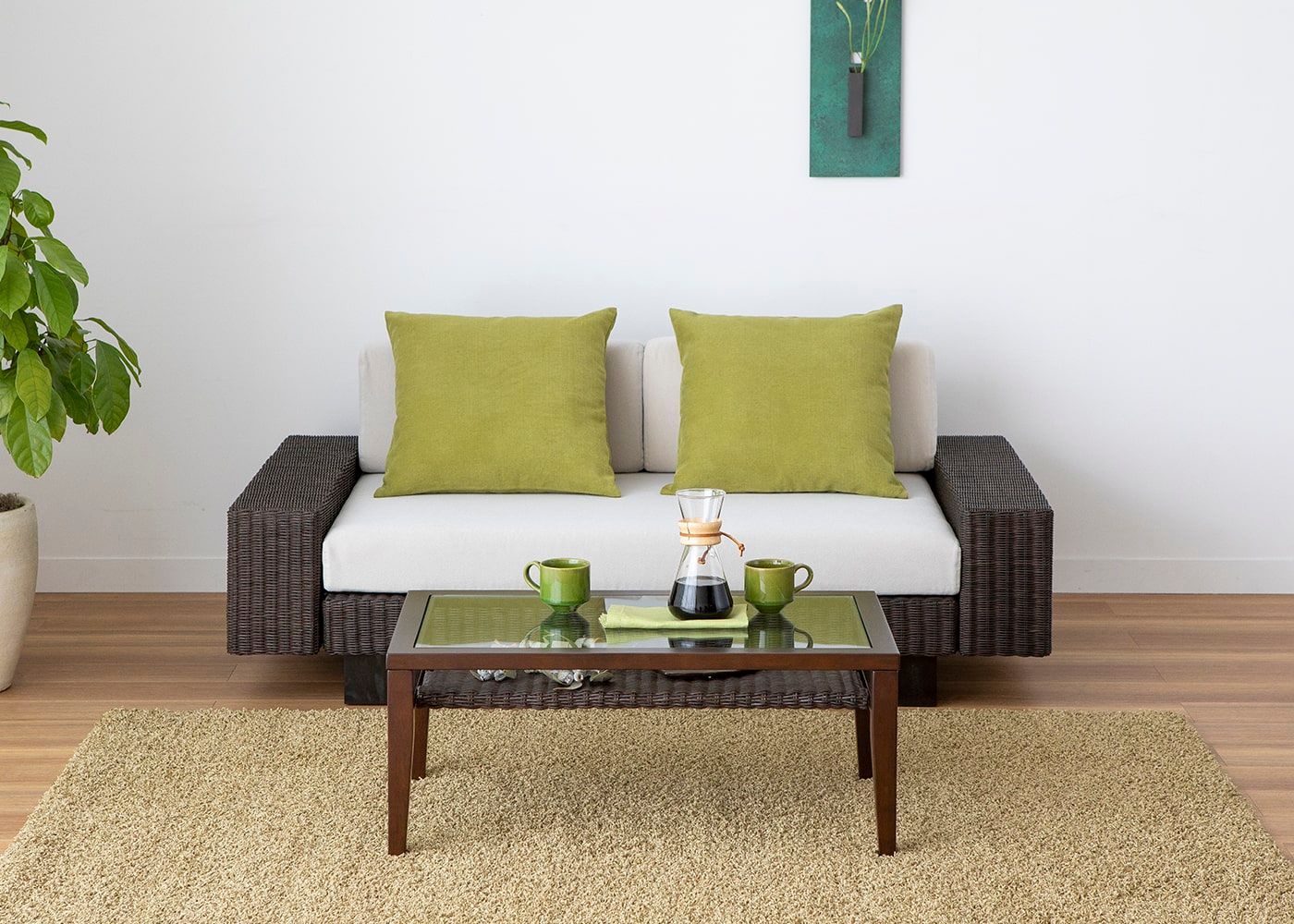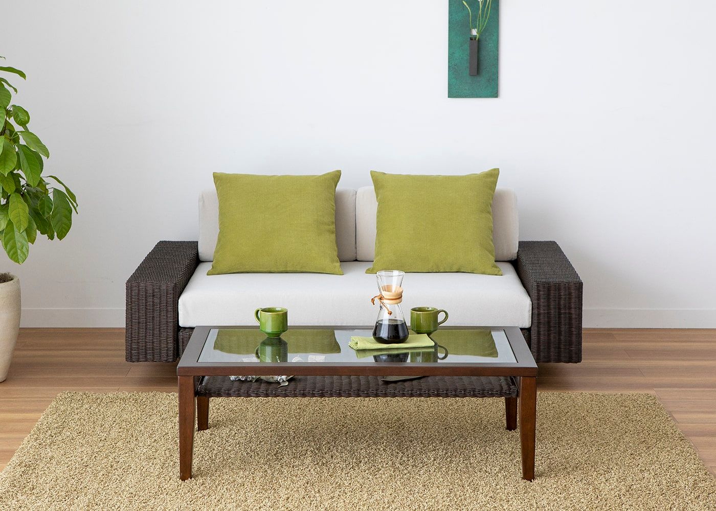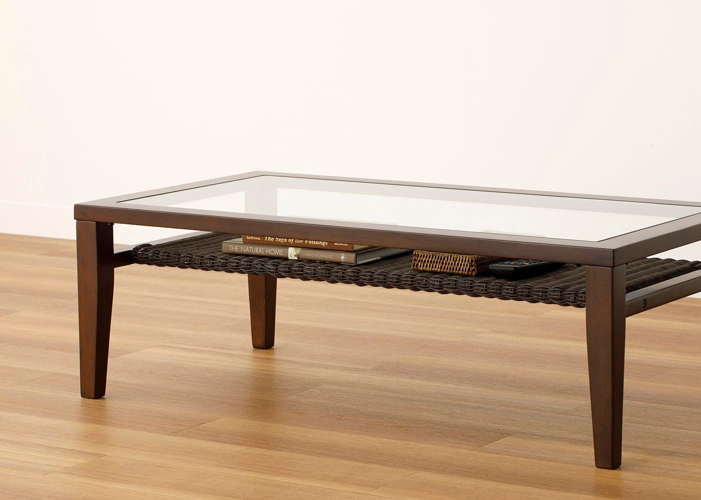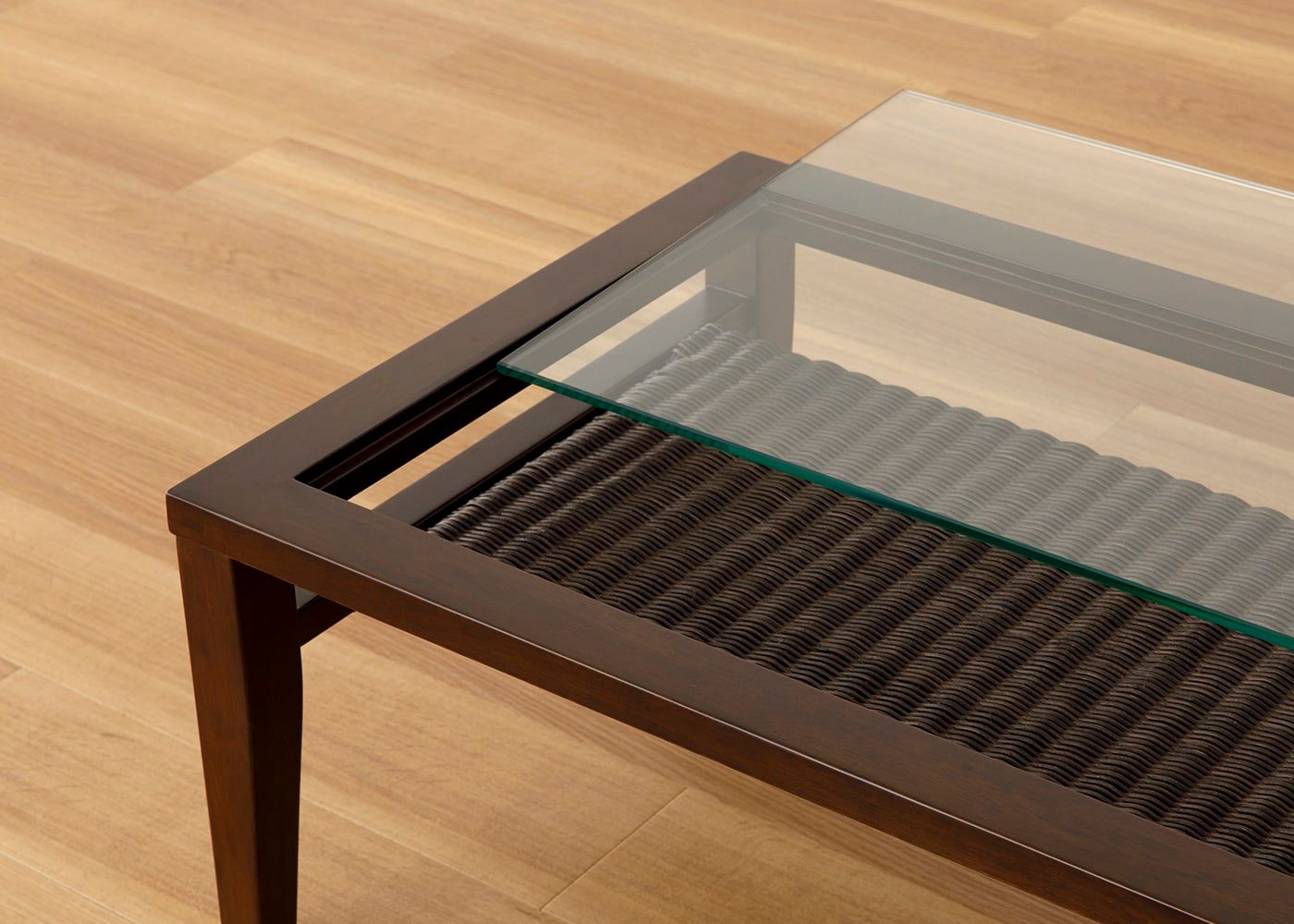 涼しげなガラスと繊細なラタンの組み合わせが、素材の温もりとリゾートのような爽やかさを感じさせるケイ・ローテーブル (ラタン)。