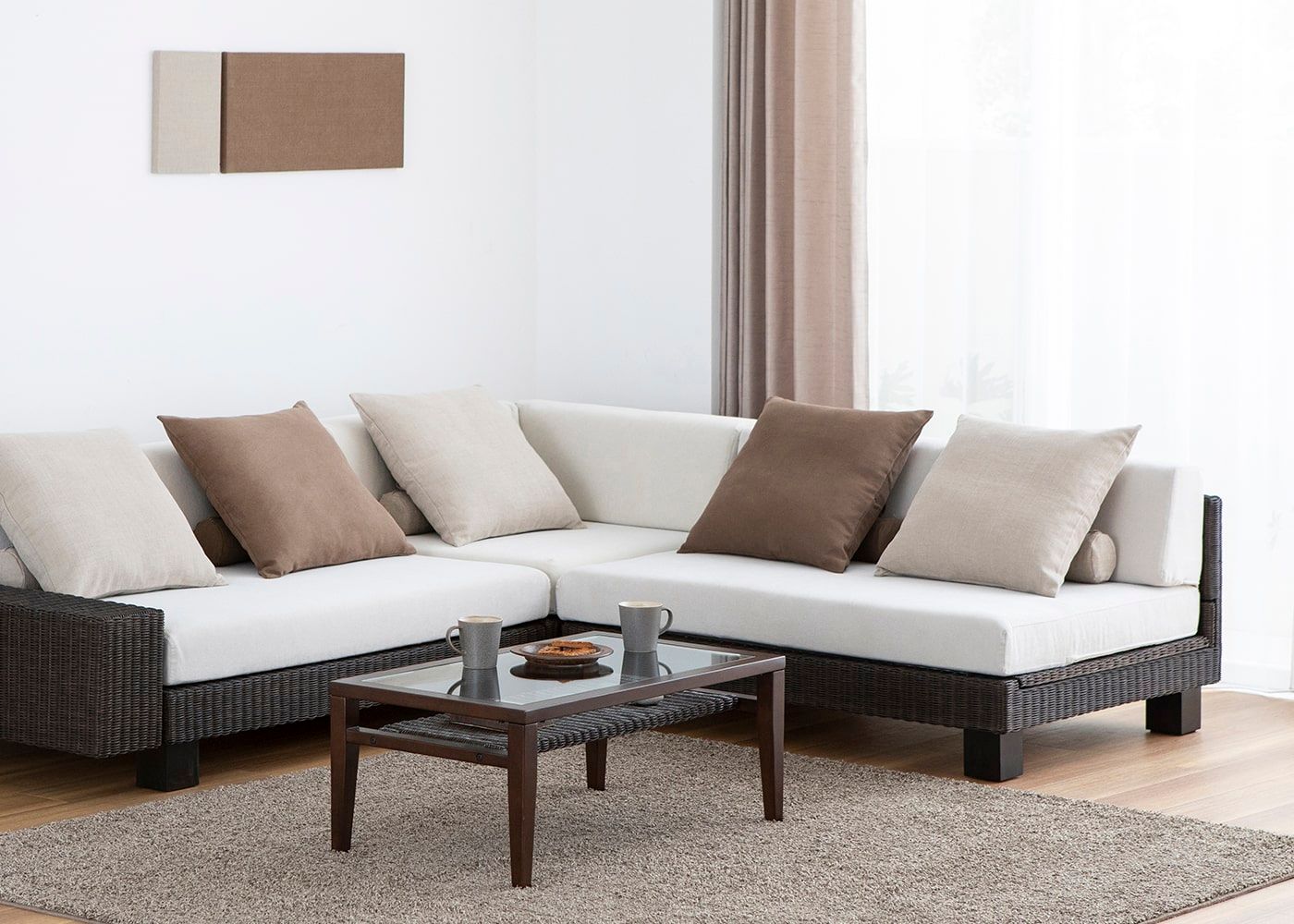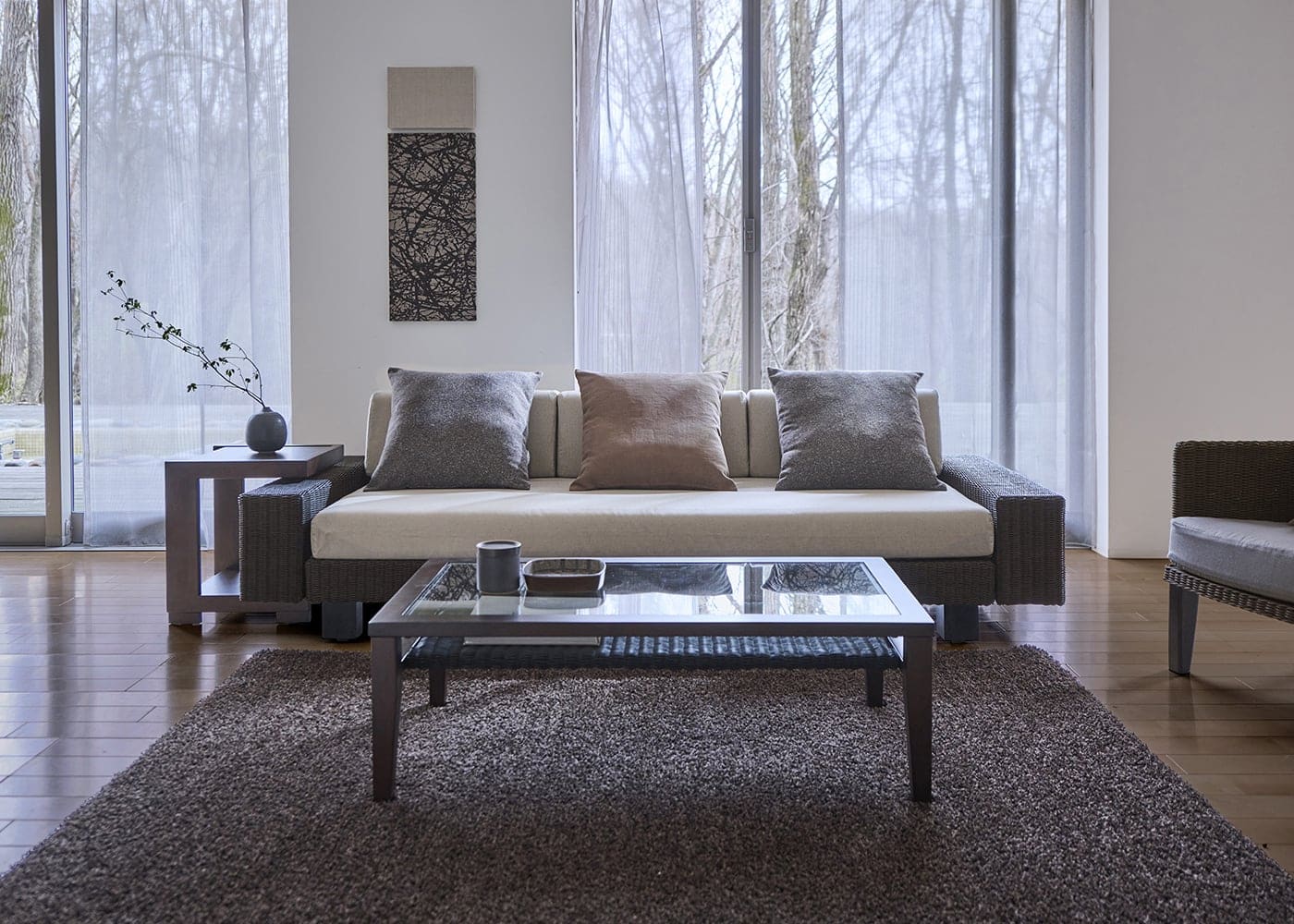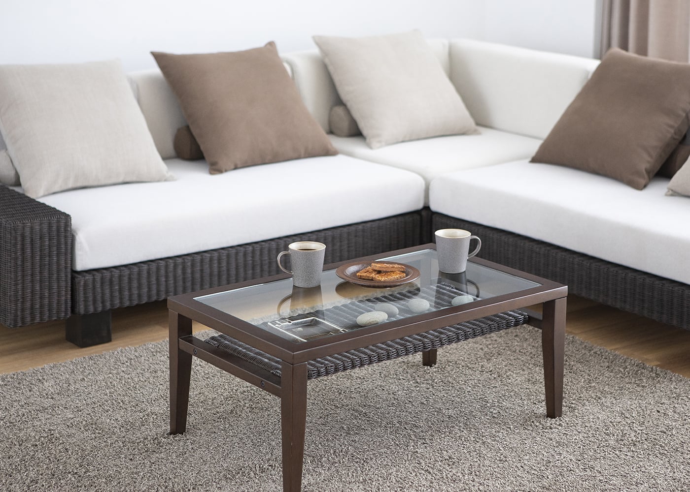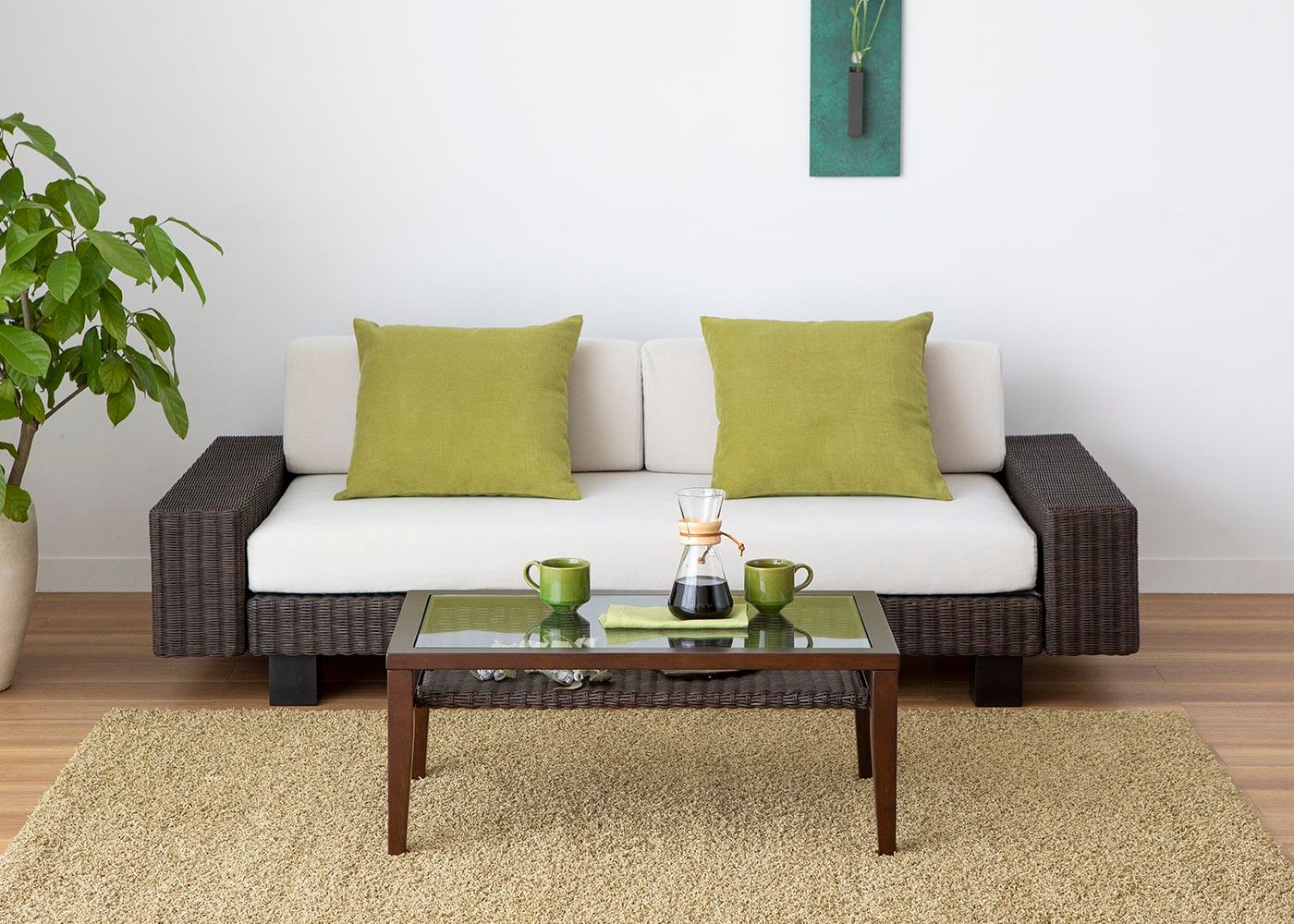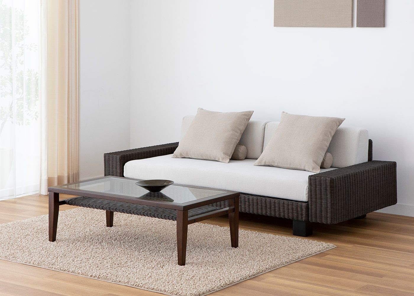 涼しげなガラスと繊細なラタンの組み合わせが、素材の温もりとリゾートのような爽やかさを感じさせるケイ・ローテーブル (ラタン)。