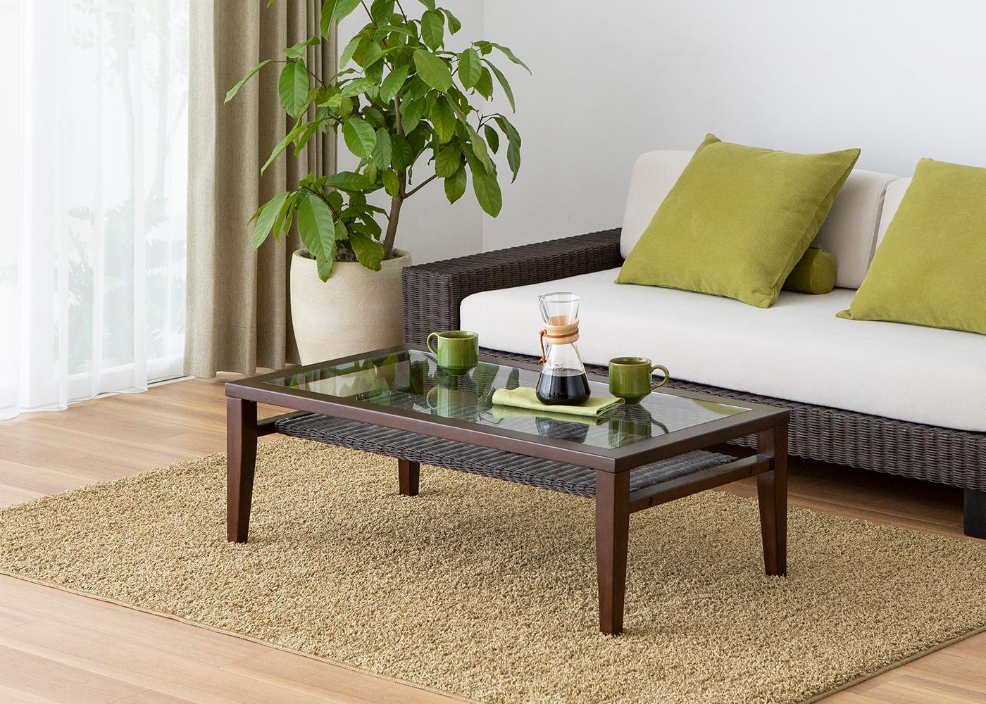 ガラス天板と高さ33cmというロースタイルが相まって、開放感を演出してくれるリゾート感漂うデザインのローテーブルです。