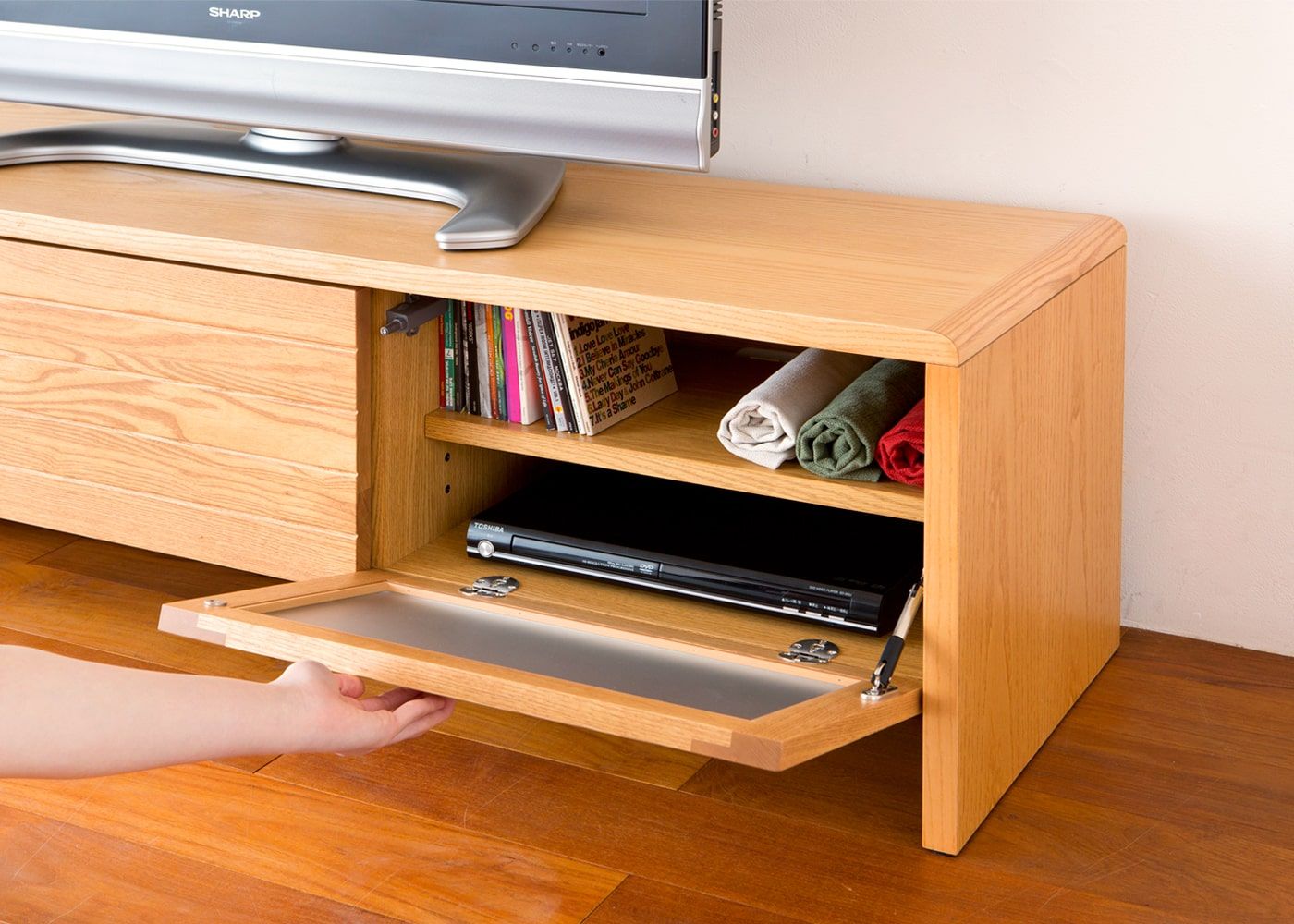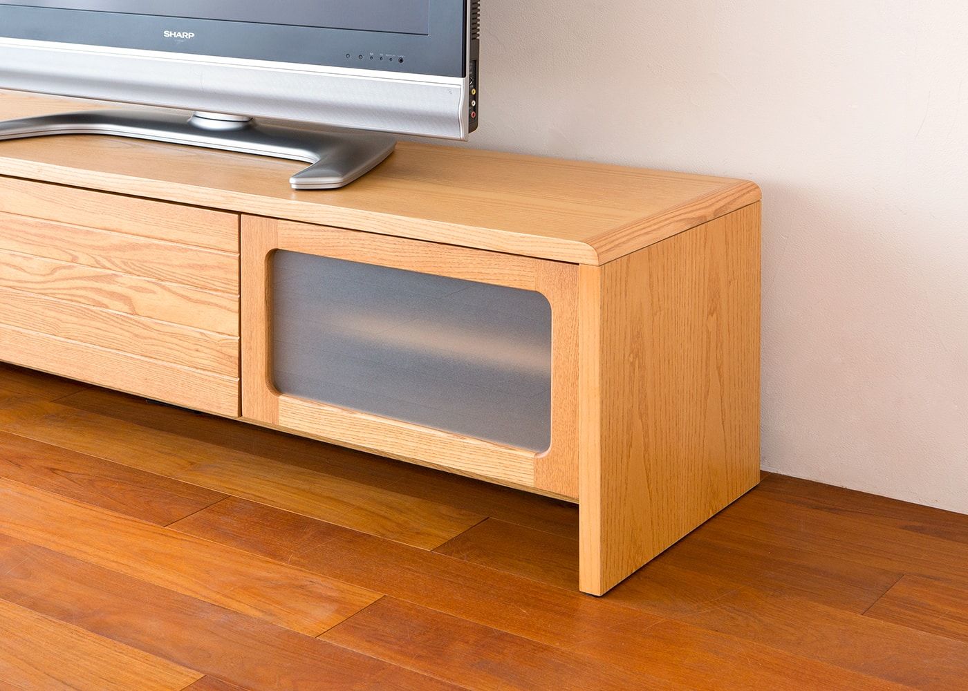 AV機器収納スペースは、内部を埃から守るガラス扉設計。扉はすりガラス調仕様のため内部が見えにくく、AV機器を収納しても素材のナチュラルな質感を邪魔しません。