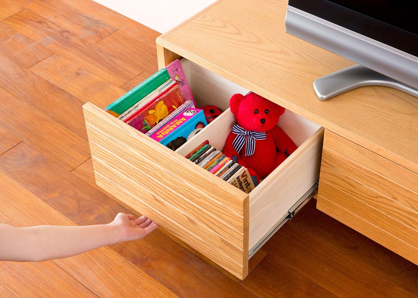 深さ235mmの引出しは十分な収納力があり、DVDやCDだけでなく雑誌や書籍なども入れられます(引出1杯に仕切板1枚付属)。脚の高さを100mmに設計することにより、掃除機のヘッドやお掃除ロボットも入り易いスペースを確保しています。
