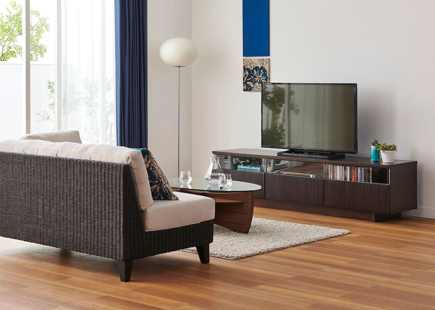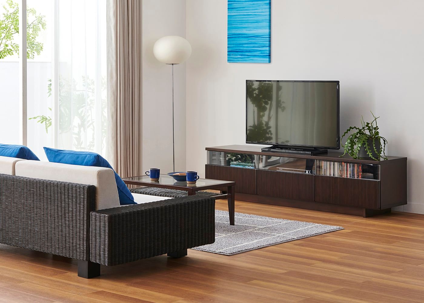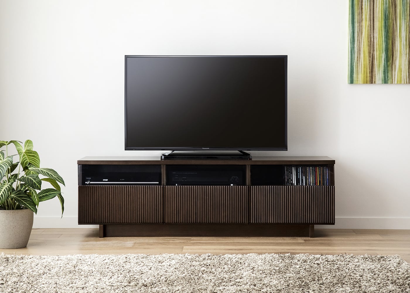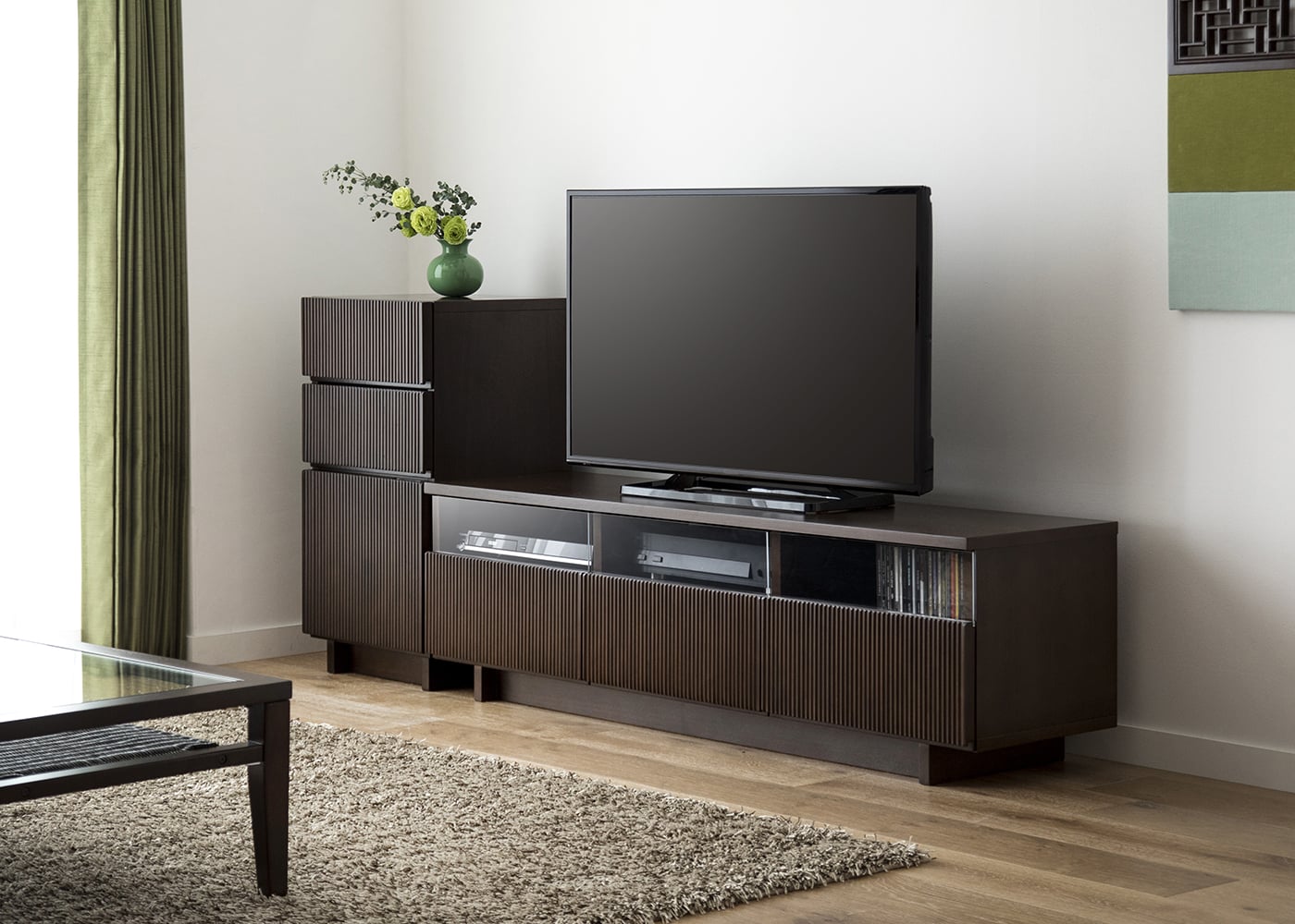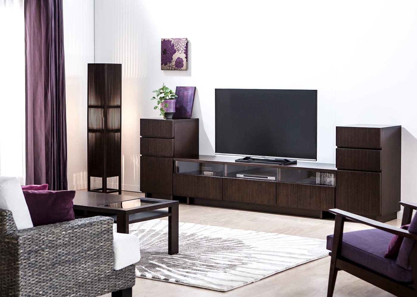 テレビボードにキャビネットを組み合わせたセットです。テレビボードの片側にキャビネットのあるv01セットと両側にあるv02セットをご用意しました。コンパクトサイズながらもテレビボードにさらに収納を増やしたい方にはv01セット、存在感のある整然とした佇まいの大人なリビング空間を演出したい方にはv02セットがおすすめです。(写真は一例です)