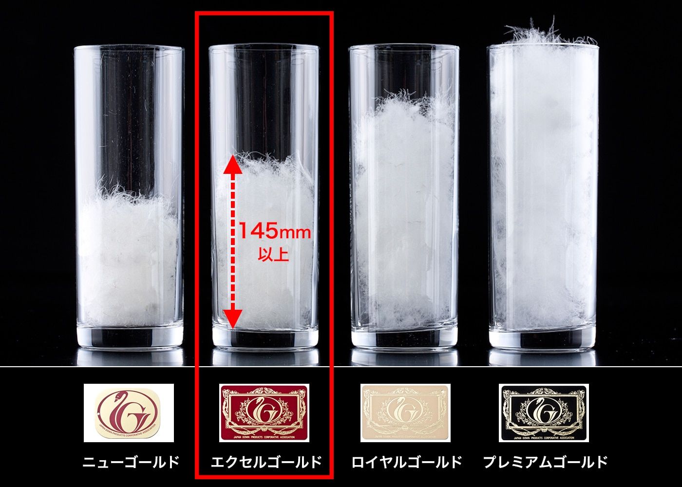 日本羽毛寝具製造業協同組合の品質基準(組成混合率、かさ高性、清浄度など)に合格した物に限り、羽毛の品質を『ダウンパワー』や『かさ高性』を基準にして下記の4つのランクのラベルで表示。