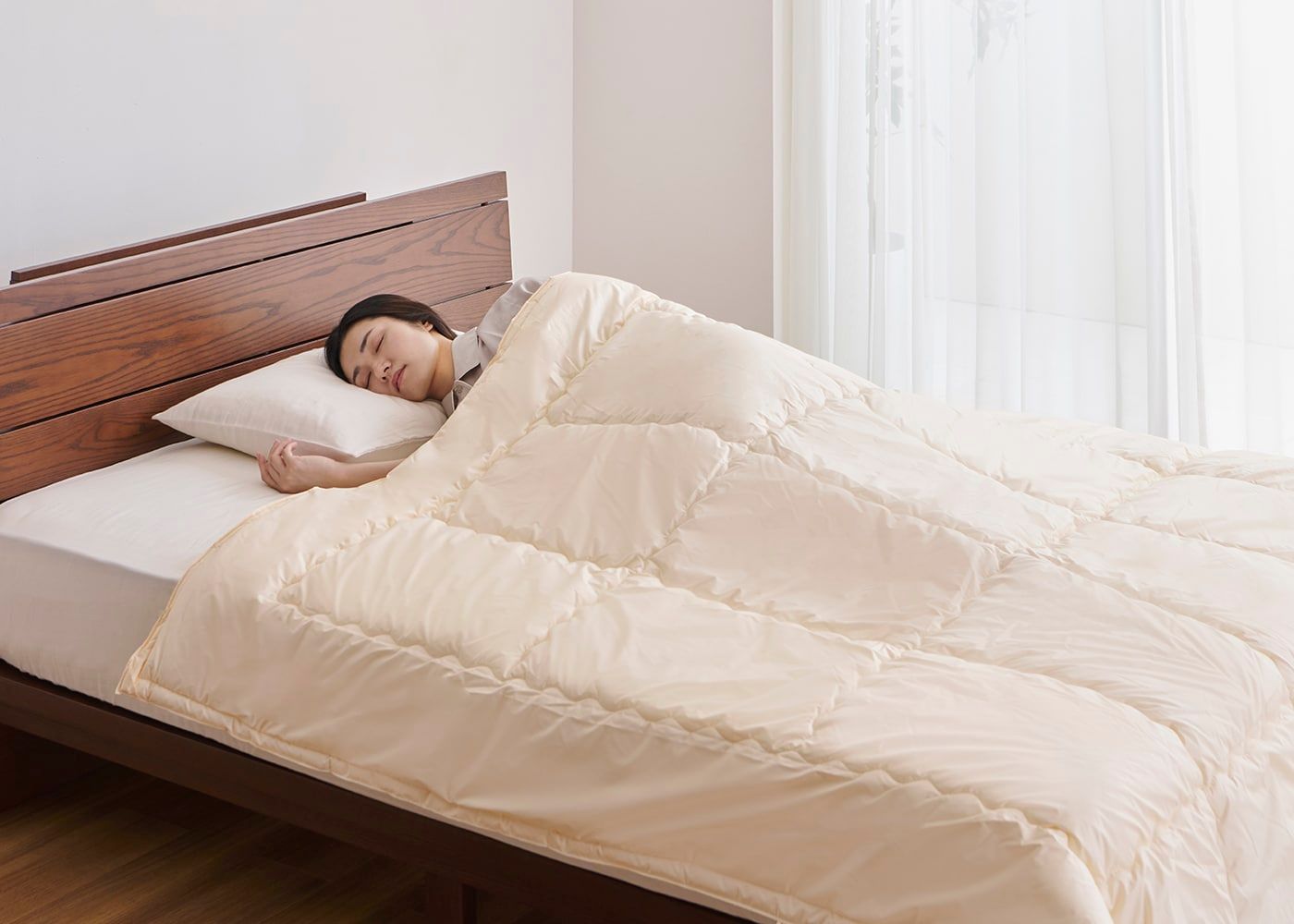 快眠には、掛け布団や毛布の組み合わせが重要です。あたたかさ・肌ざわり・軽さなどの「お好みの組み合わせ」を選び、快眠の環境を整えましょう。(写真は