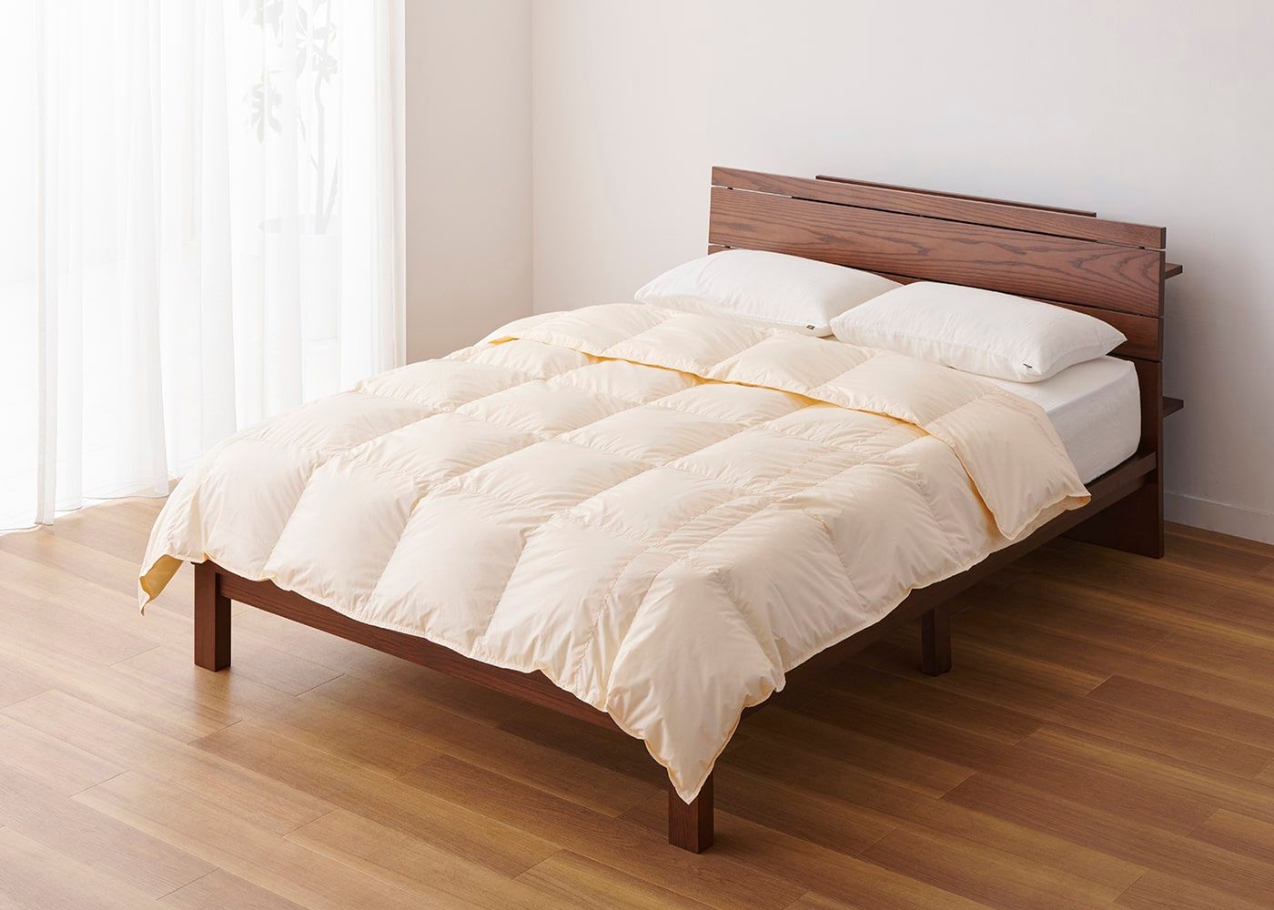 薄くて軽い、使い勝手抜群の羽毛肌掛け布団。夏は冷房による寝冷えを防いでくれたり、春秋の肌寒い時期は掛け布団や毛布と組み合わせることで、暖かさをプラスしてくれます。(写真のサイズはダブル)