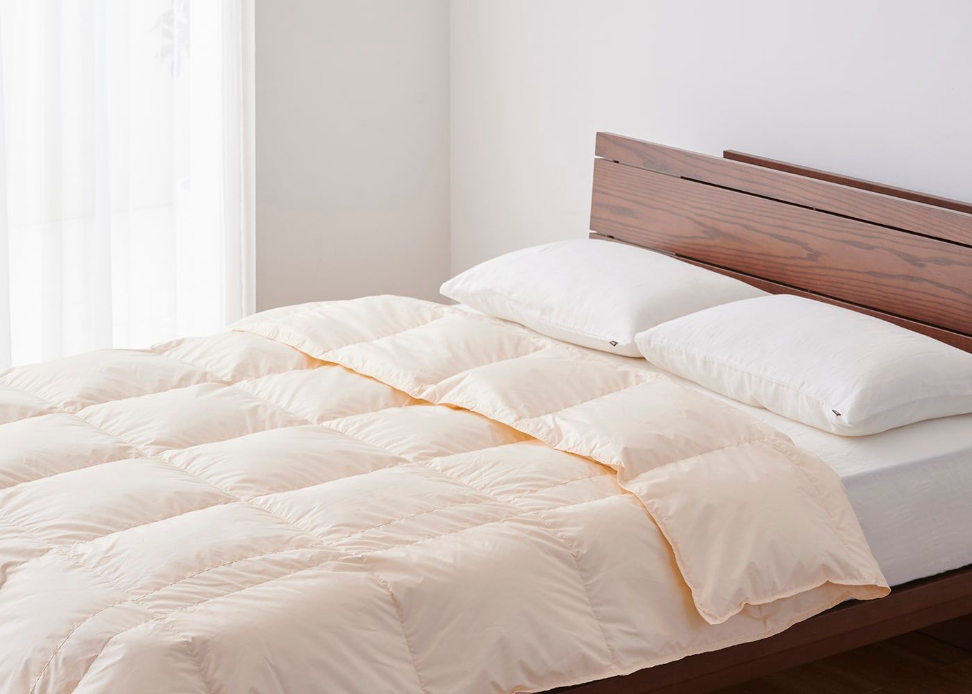 かろやかな使用感と通気性が魅力の羽毛肌掛け布団。単体で使用したり、他の掛け布団・毛布などと組み合わせて使うことで、オールシーズンご利用可能です。