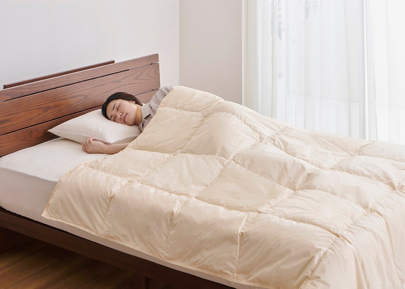 快眠には、掛け布団や毛布の組み合わせが重要です。あたたかさ・肌ざわり・軽さなどの「お好みの組み合わせ」を選び、快眠の環境を整えましょう。(写真は