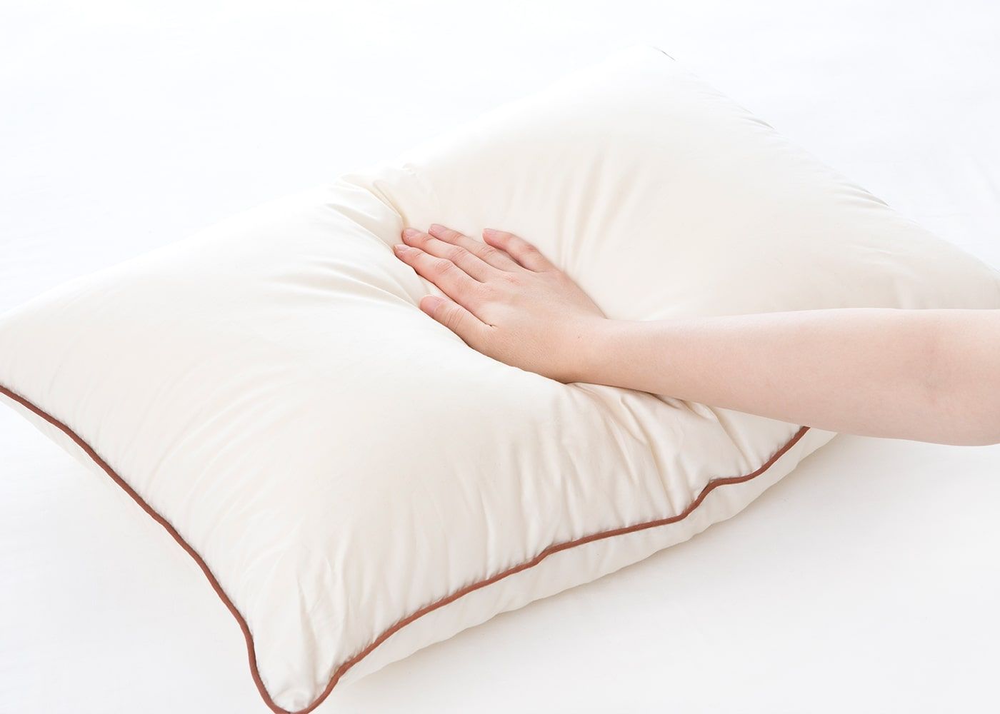 枕の高さのイメージ。高すぎず低すぎないちょうど良い高さの枕です。頭の動きに沿って中綿が移動することで、頭と首をしっかり支えて安定した姿勢を保ってくれます。(写真のサイズは普通)