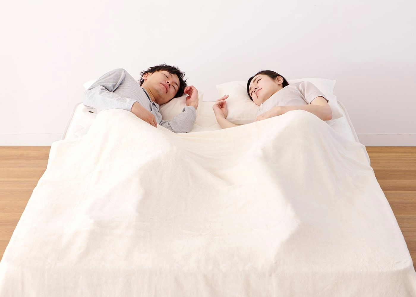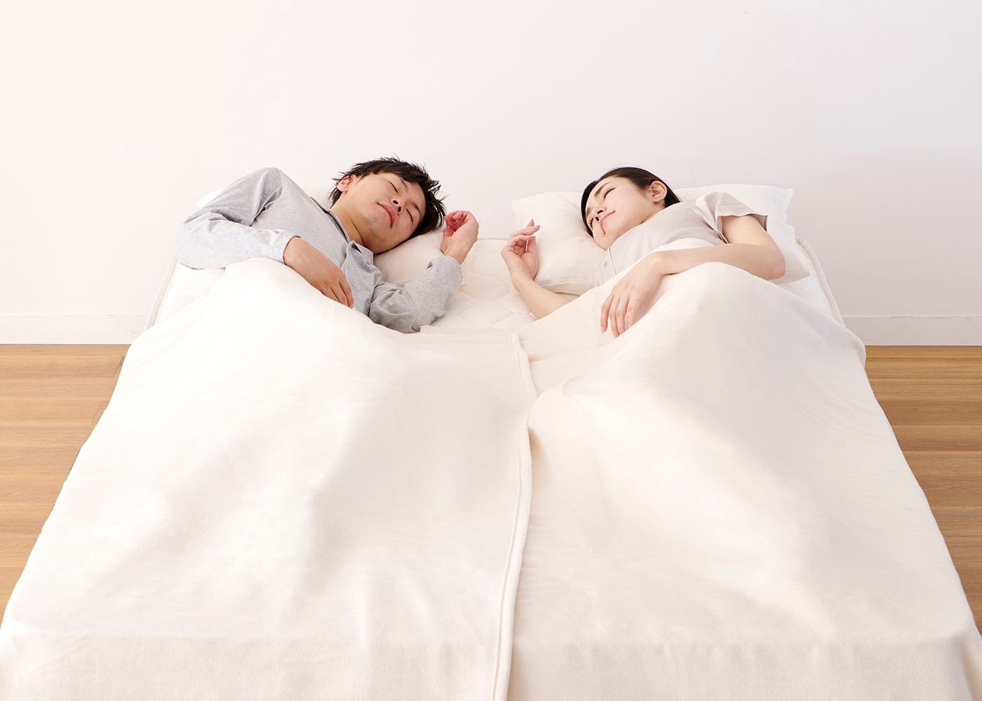 2人でゆったりお休みになりたい時は、シングルの毛布を1枚づつご利用頂くのもおすすめです。お互いの寝返りや寝相を気にせず快眠しやすくなるでしょう。(写真の毛布サイズはシングル×2、ベッドはダブル)