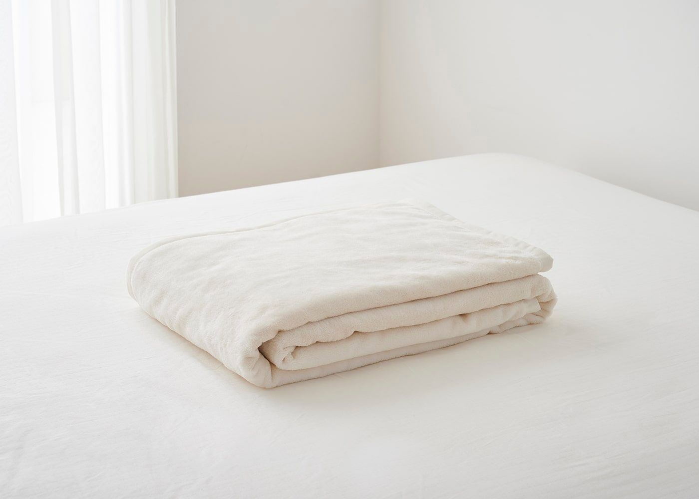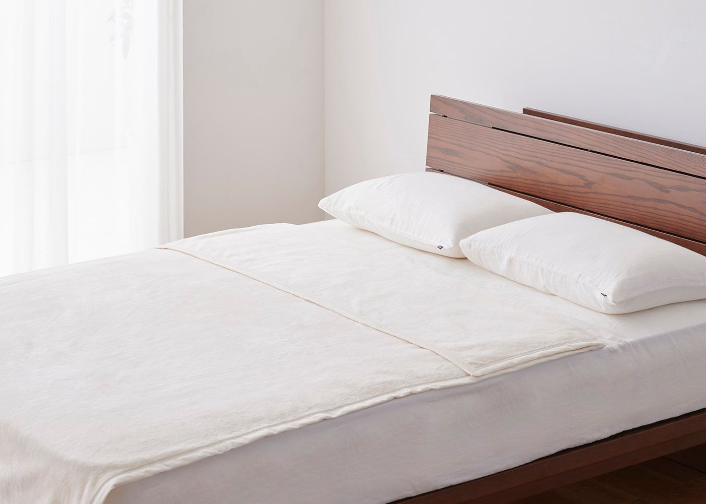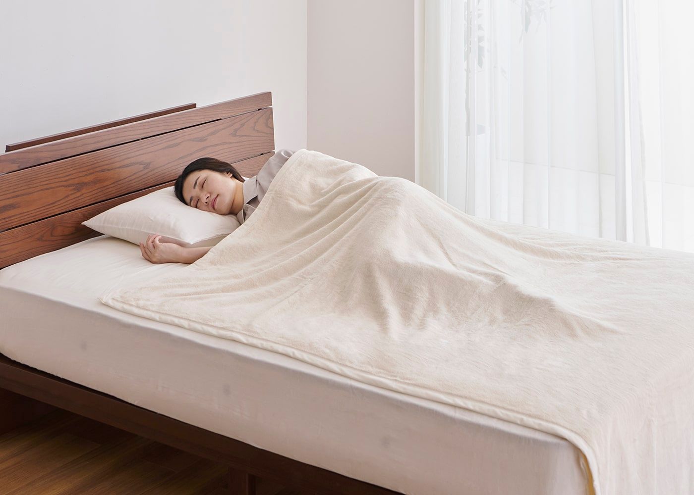 掛け布団をお使いの場合は、布団の上に毛布を掛けるとより保温効果が高まります。布団内の暖気を逃がさず冷気も進入してこないように、毛布がフタの役割を果たしてくれるからです。(写真は