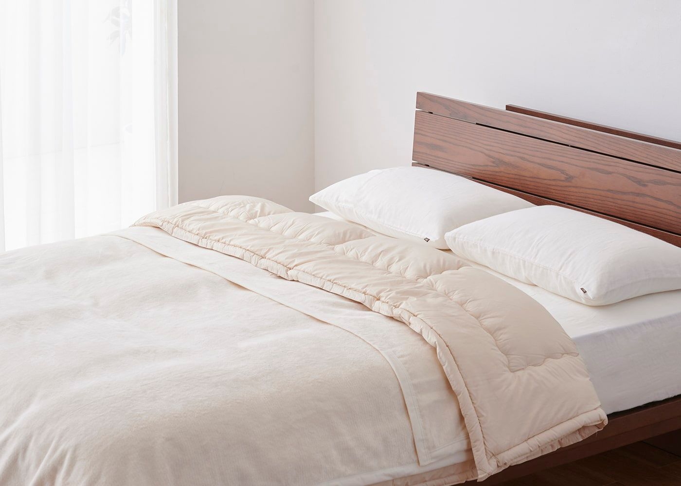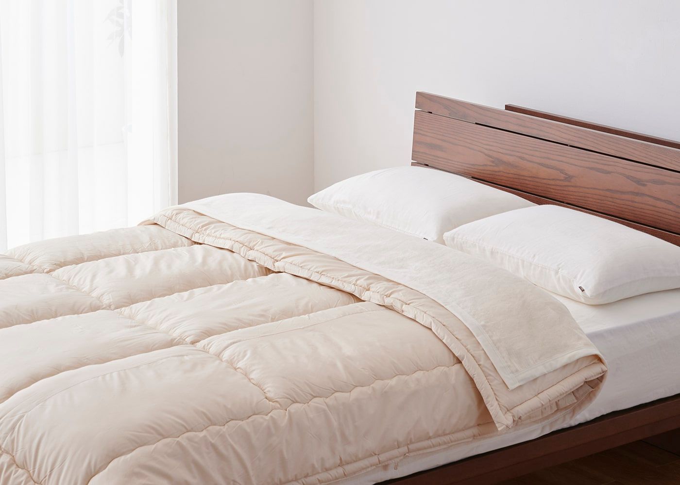 快眠には、掛け布団や毛布の組み合わせが重要です。あたたかさ・肌ざわり・軽さなどの「お好みの組み合わせ」を選び、快眠の環境を整えましょう。コットンの感触を楽しみたい時は布団の内側に使ってください。(写真は