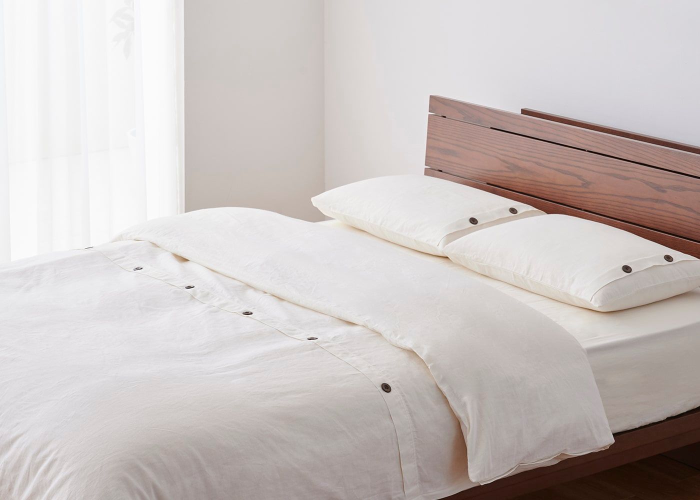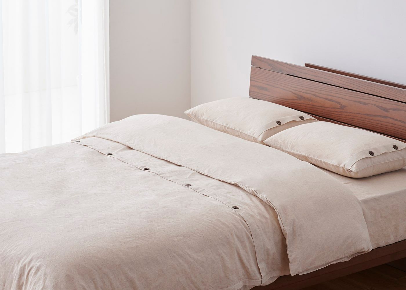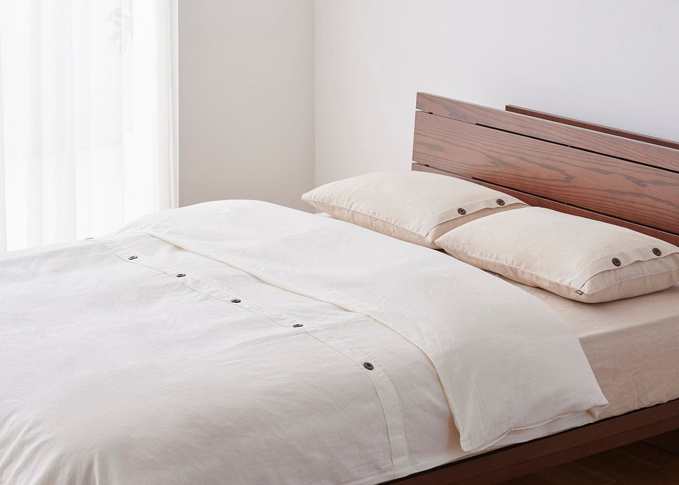 素材を生かした独特のシャリ感と風合いが、ワンランク上の寝室を演出してくれる上品な仕上がりになりました。アクセントに天然木(ヤシ)のボタンをあしらっています。(写真のカラーは生成り)