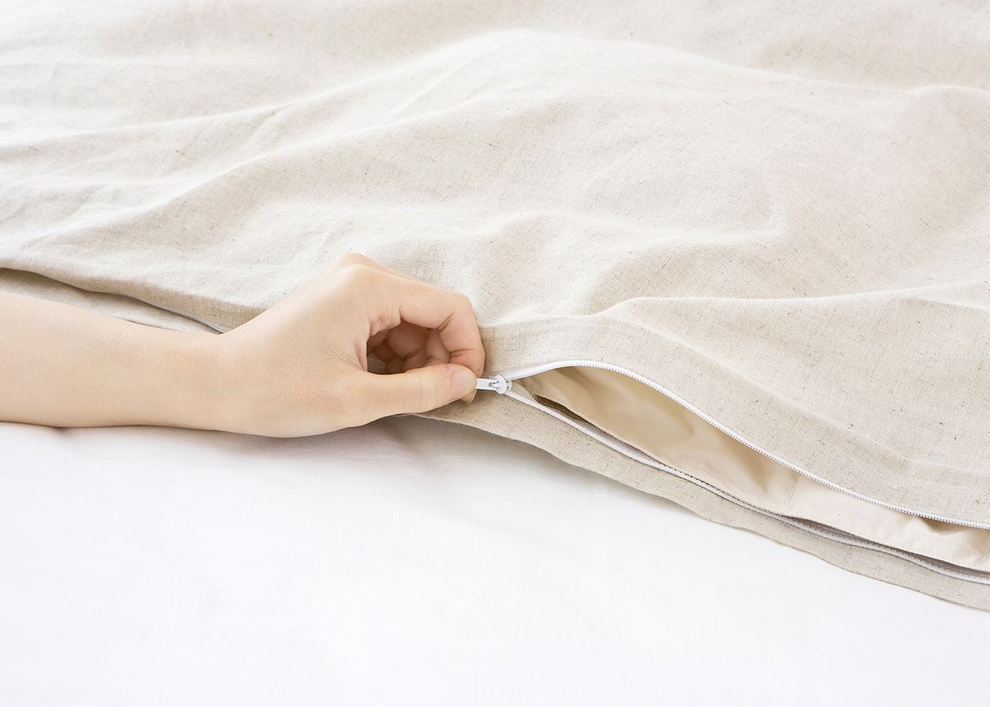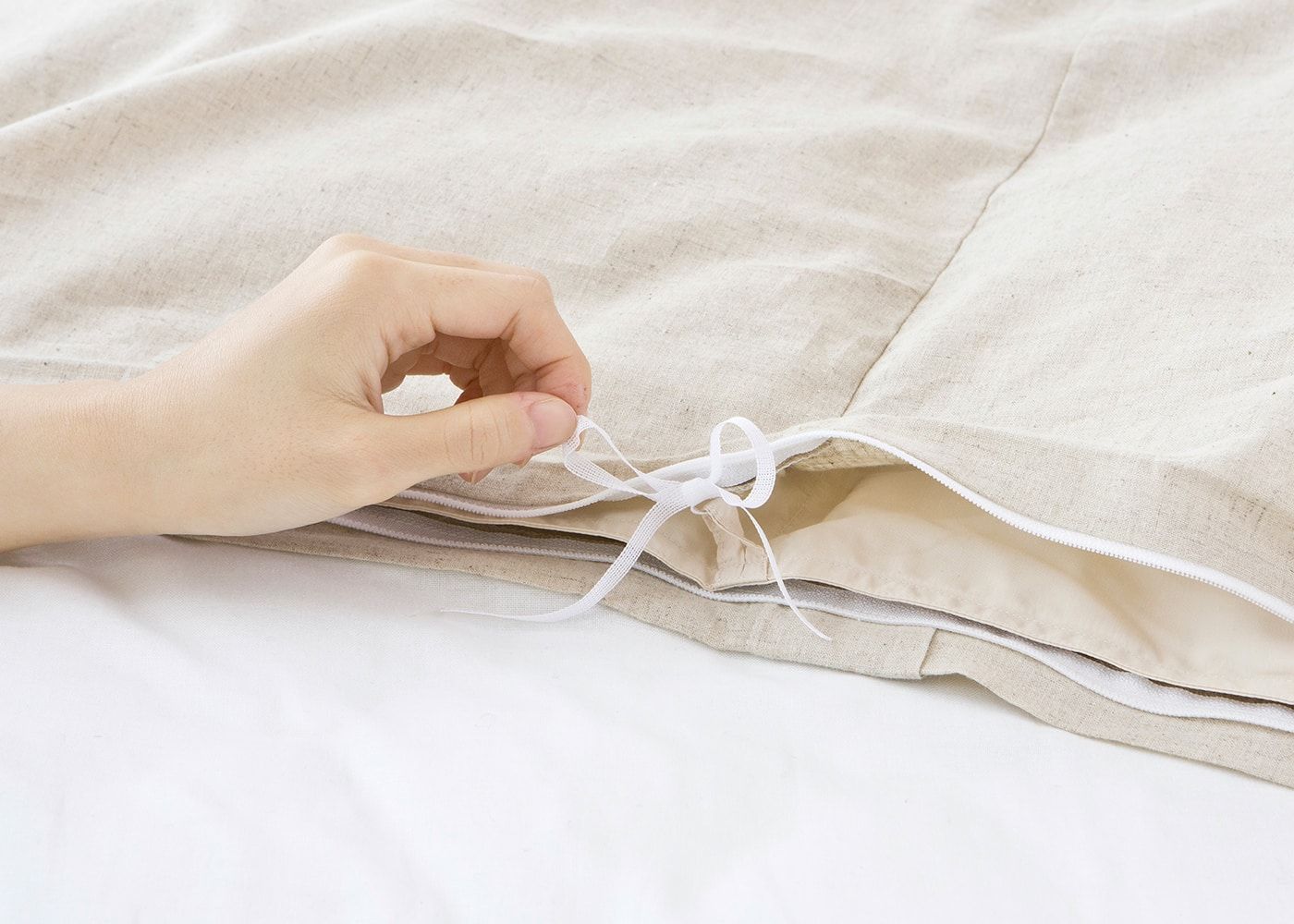 麻ならではの独特の質感、肌ざわりが穏やかな眠りへと誘います。また、吸湿性と放湿性だけでなく、保温性にも優れているため冬にもおすすめの素材です。(写真のカラーは生成り)