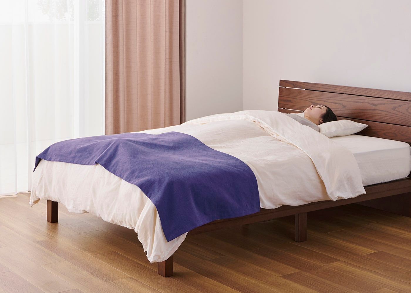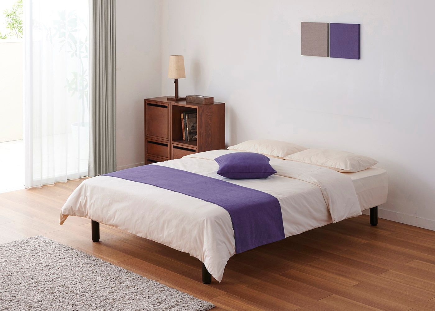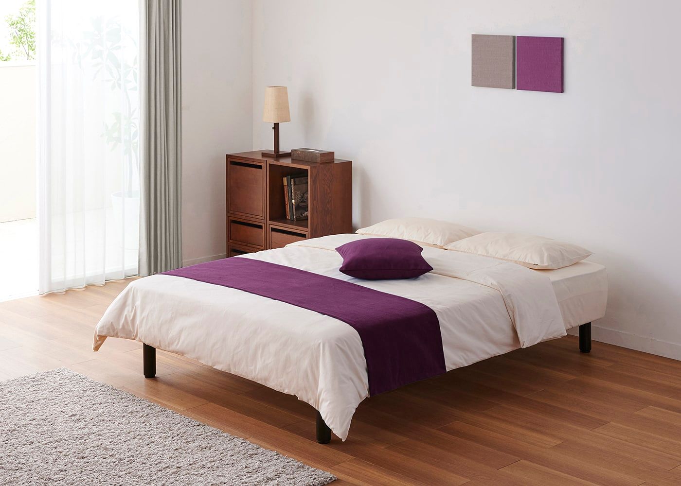 ベッドスローは見た目の変化だけではなく、様々な機能性も併せ持っています。肌寒い日には下側に掛けておくことで、足元を温めて快適な睡眠を得られることも。(写真はダブル・奥行650 CLグレープ)