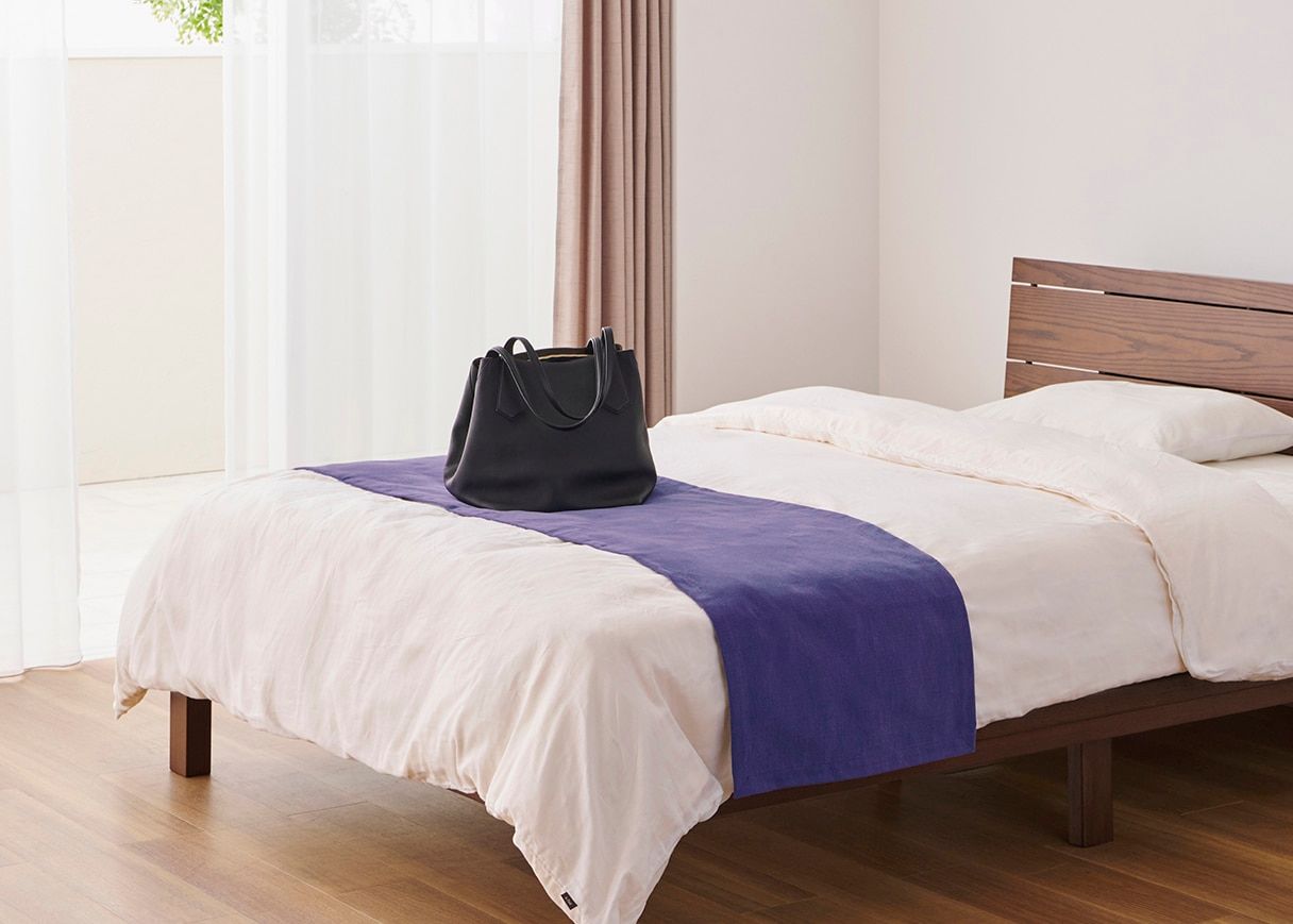 ベッドのカバーリング感覚で掛けておくことで、荷物を置いたりすることもできます。インテリア性と機能性を兼ね備えたベッドスプレッドで、寝室の暮らしを充実させましょう。(写真はダブル・奥行450 CLグレープ)
