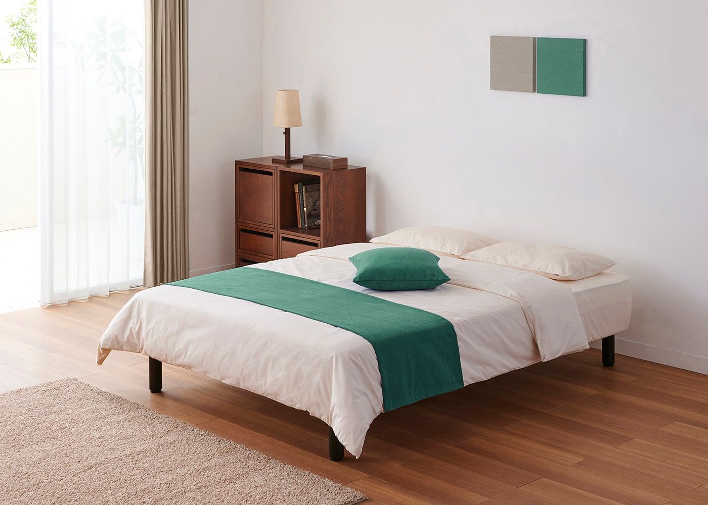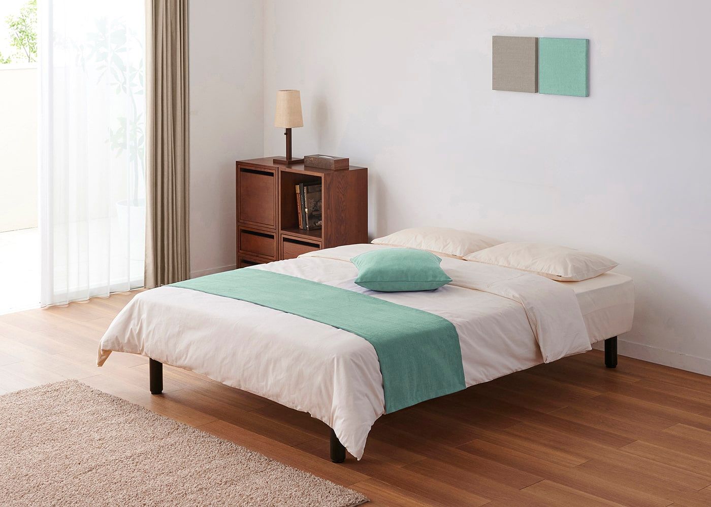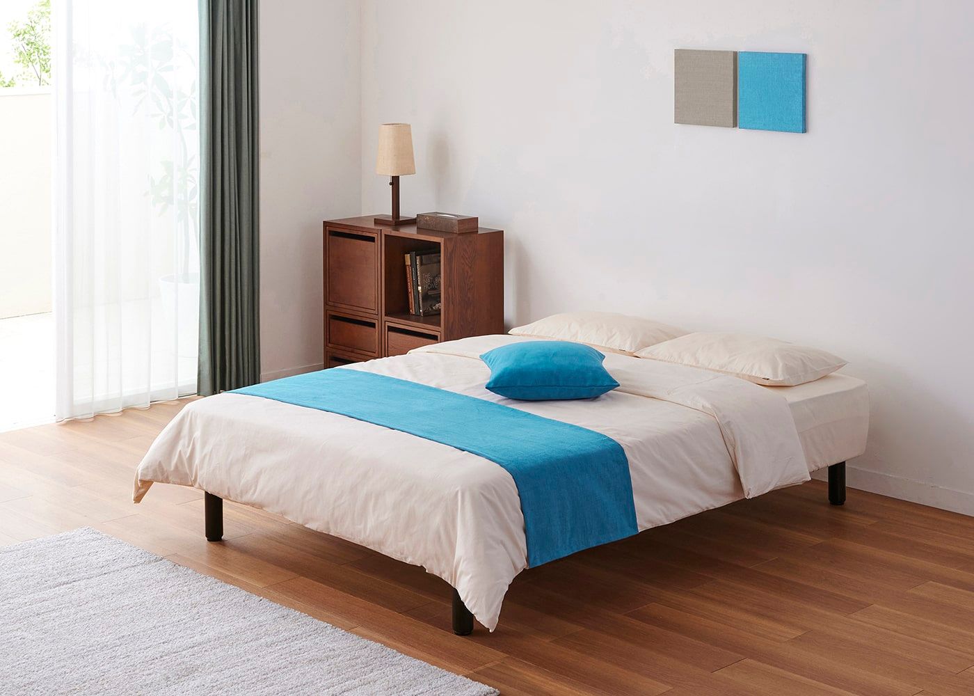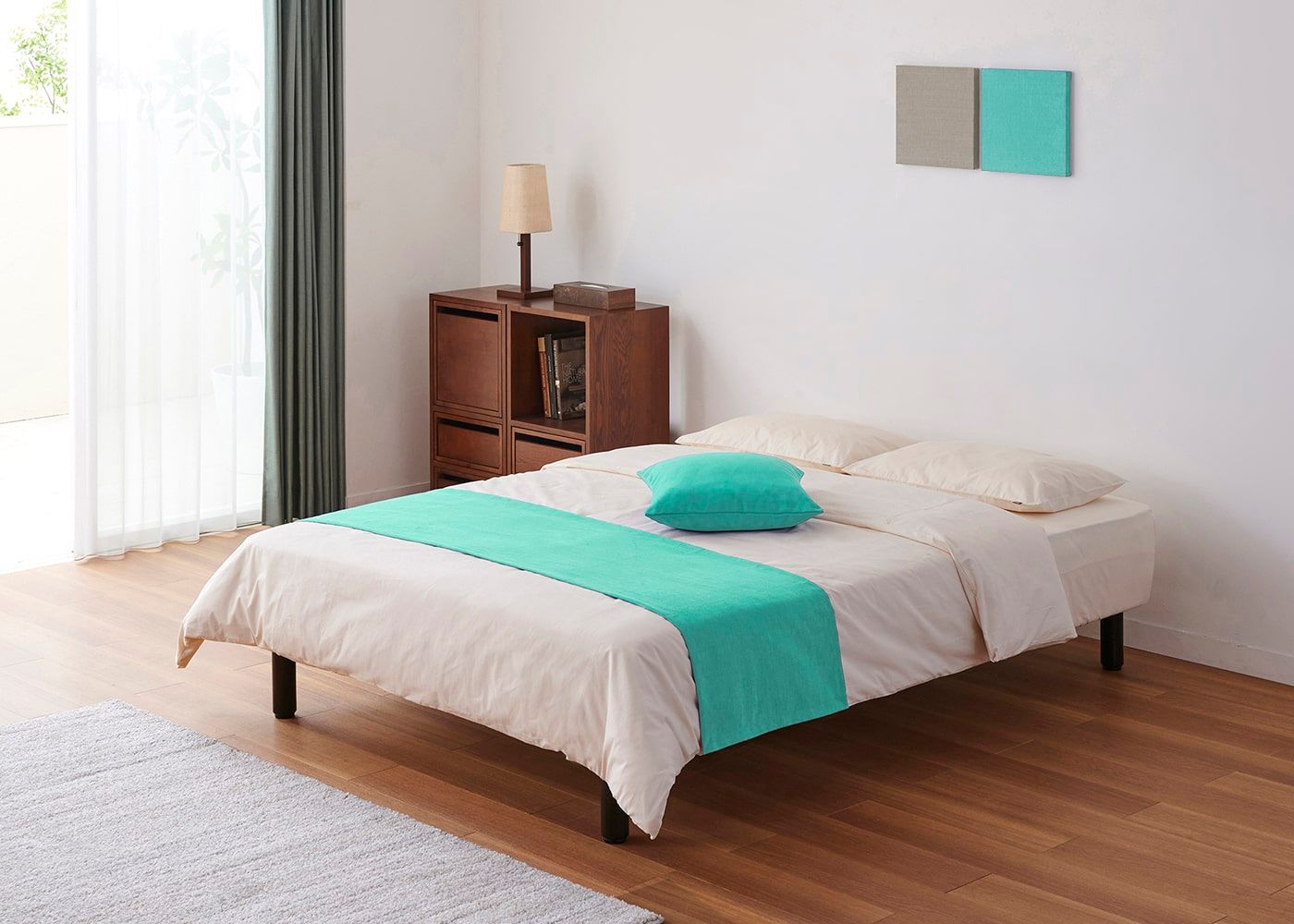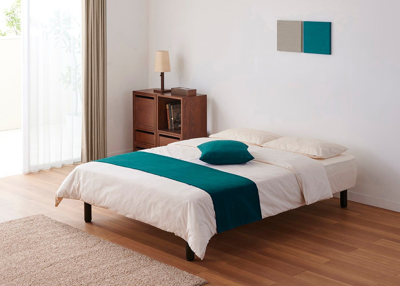 寝室はリビングなどに比べてインテリアコーディネートしにくいと思われていますが、ベッドスローや壁面装飾を添えるだけでも気軽に雰囲気づくりが可能です。お好みのインテリアをプラスして、充実したベッドライフを楽しんでみましょう。(写真はダブル・奥行650 CLターコイズ)