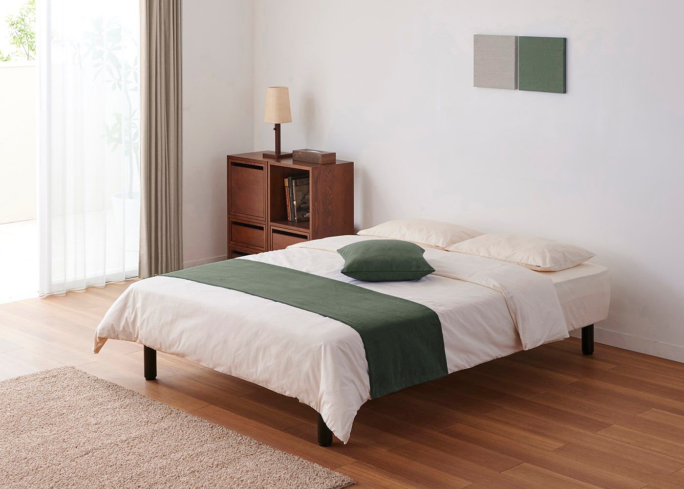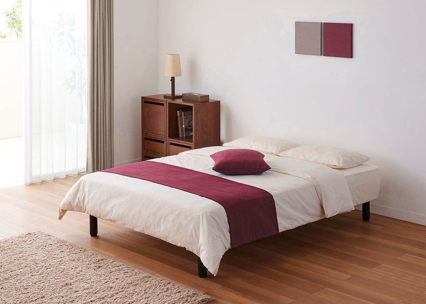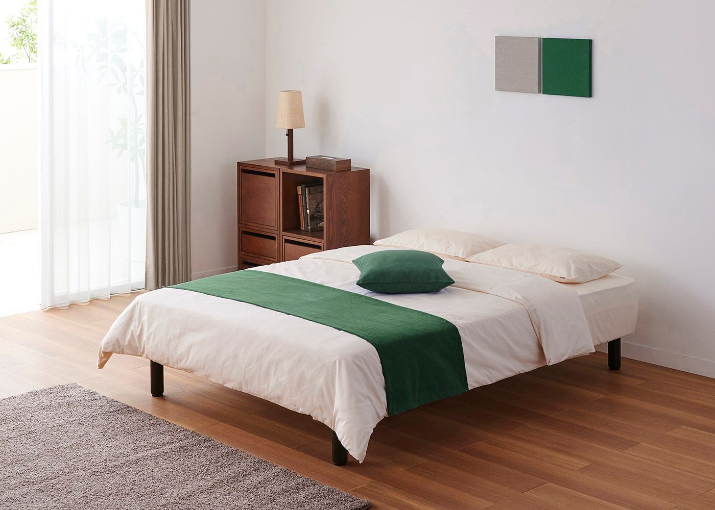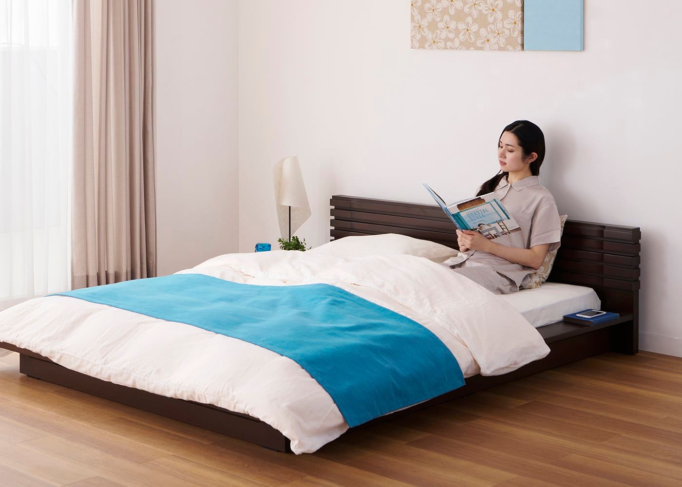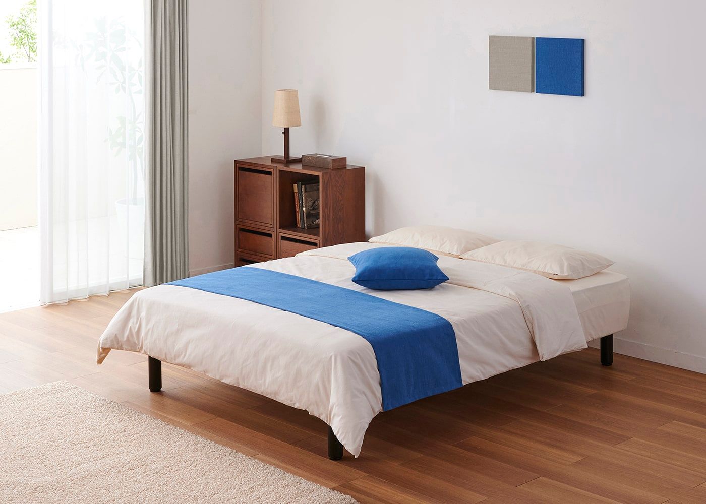 寝室はリビングなどに比べてインテリアコーディネートしにくいと思われていますが、ベッドスローや壁面装飾を添えるだけでも気軽に雰囲気づくりが可能です。お好みのインテリアをプラスして、充実したベッドライフを楽しんでみましょう。(写真はダブル・奥行650 CLターコイズ)