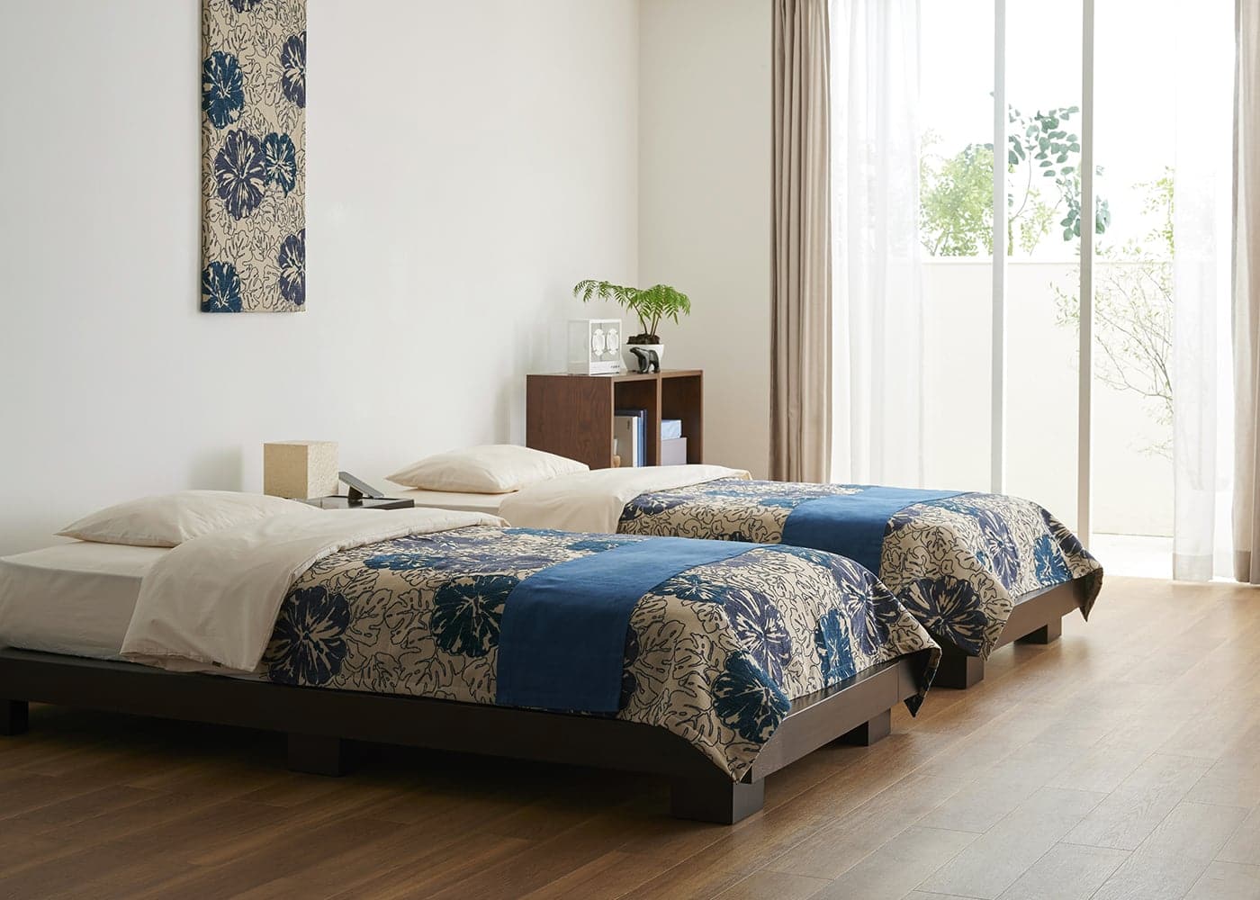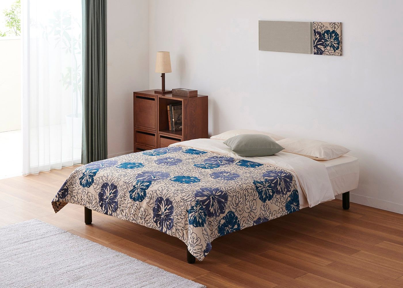ハイビスカスのベッドスプレッドが主役の寝室コーディネート例。開放的なブルーで彩ったローベッドや、壁面には同シリーズのアートパネルで統一感を演出しました。非日常感のある寝室で毎日を過ごしてみては?(写真はHBブルー。ベッドスローは