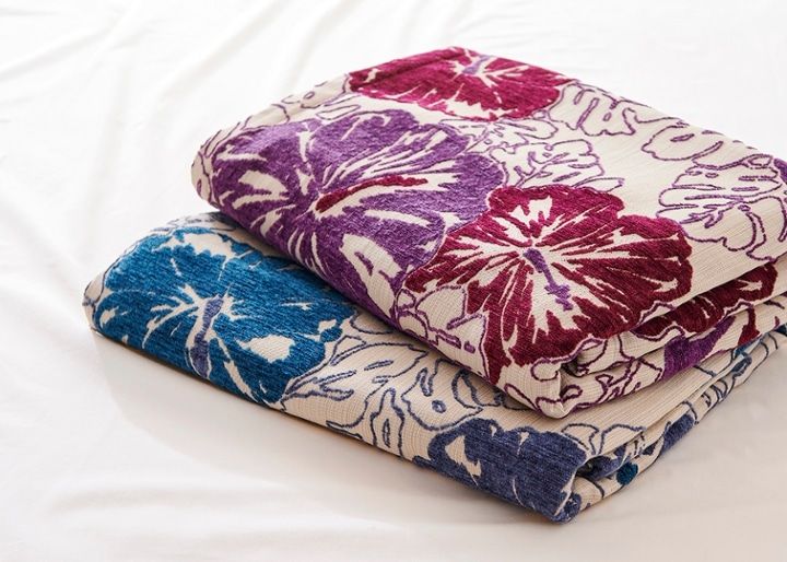 リゾート地に大きく大胆に咲き誇る、ハイビスカスのデザインが魅力のベッドスロー (ハイビスカス)。光沢のあるふっくらしたモール糸で花を大胆に描いた表情豊かなファブリックです。(写真はダブル・奥行450 HBブルー)