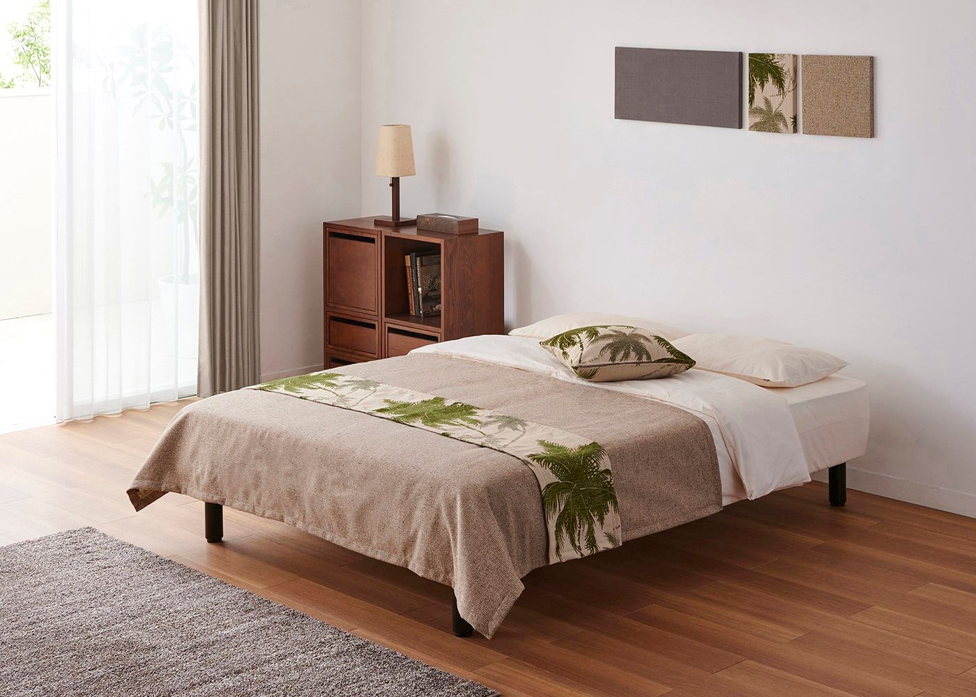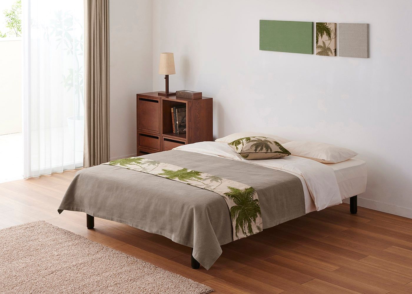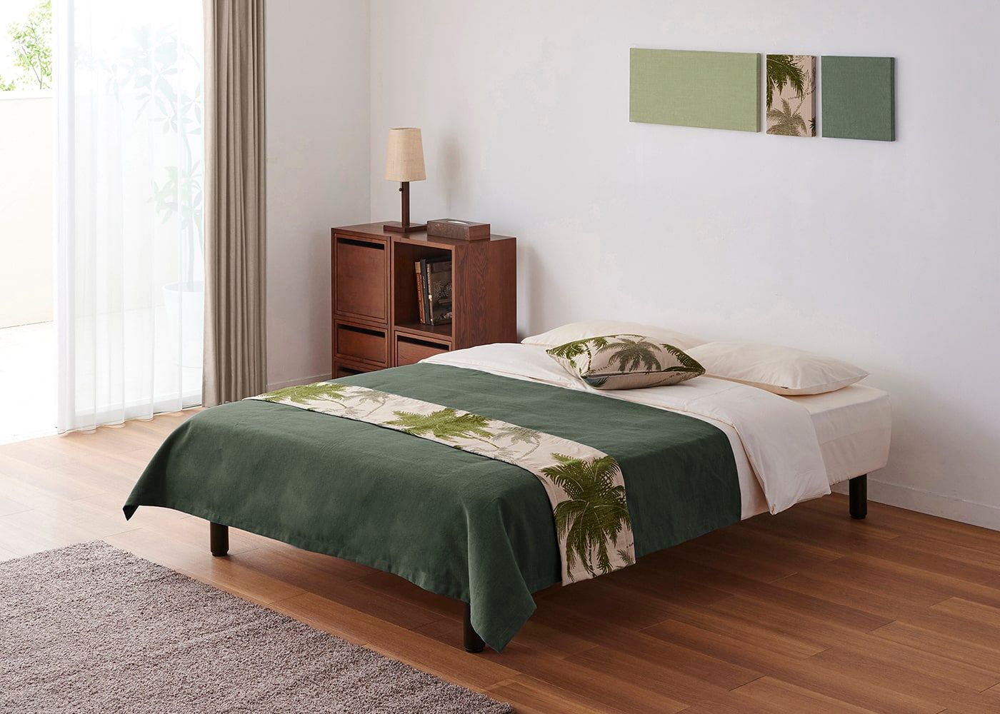 (パーム)を主役にしたコーディネートは無限に存在します。多彩なインテリアアイテムと合わせて、自分だけの理想的な寝室を叶えてみましょう。(写真はベッドスプレッド 奥行1300