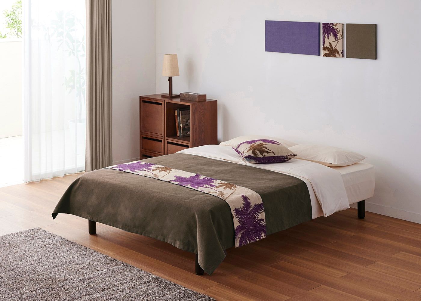 海辺などのマジックアワーを彷彿とさせる、夕方の黄昏時をイメージしたパープルとブラウンの組み合わせもご用意しています。自宅をリゾートムード漂う空間に変えてくれるベッドスローです。(写真はPRパープル)