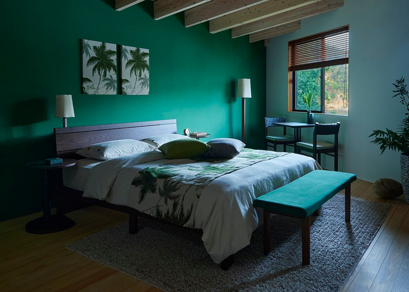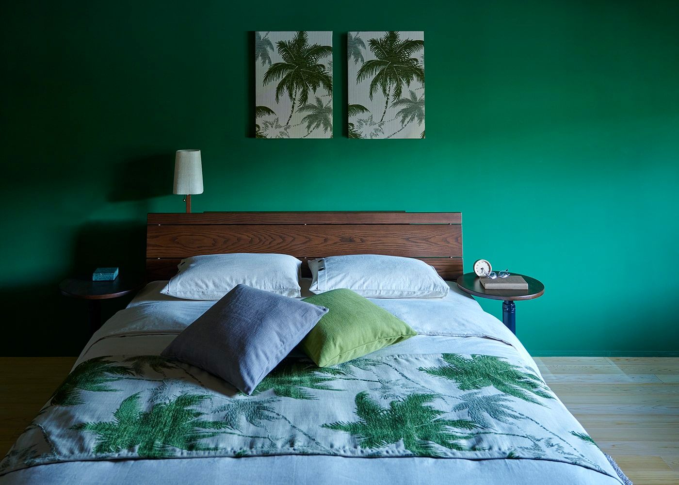 ハワイの澄み切った朝の時間帯がテーマの寝室コーディネート例。爽やかな癒しのグリーンに包まれた空間に、ヤシ柄のベッドスローやアートパネルが映えています。(写真はベッドスプレッド 奥行650 PRグリーンと、アートパネル