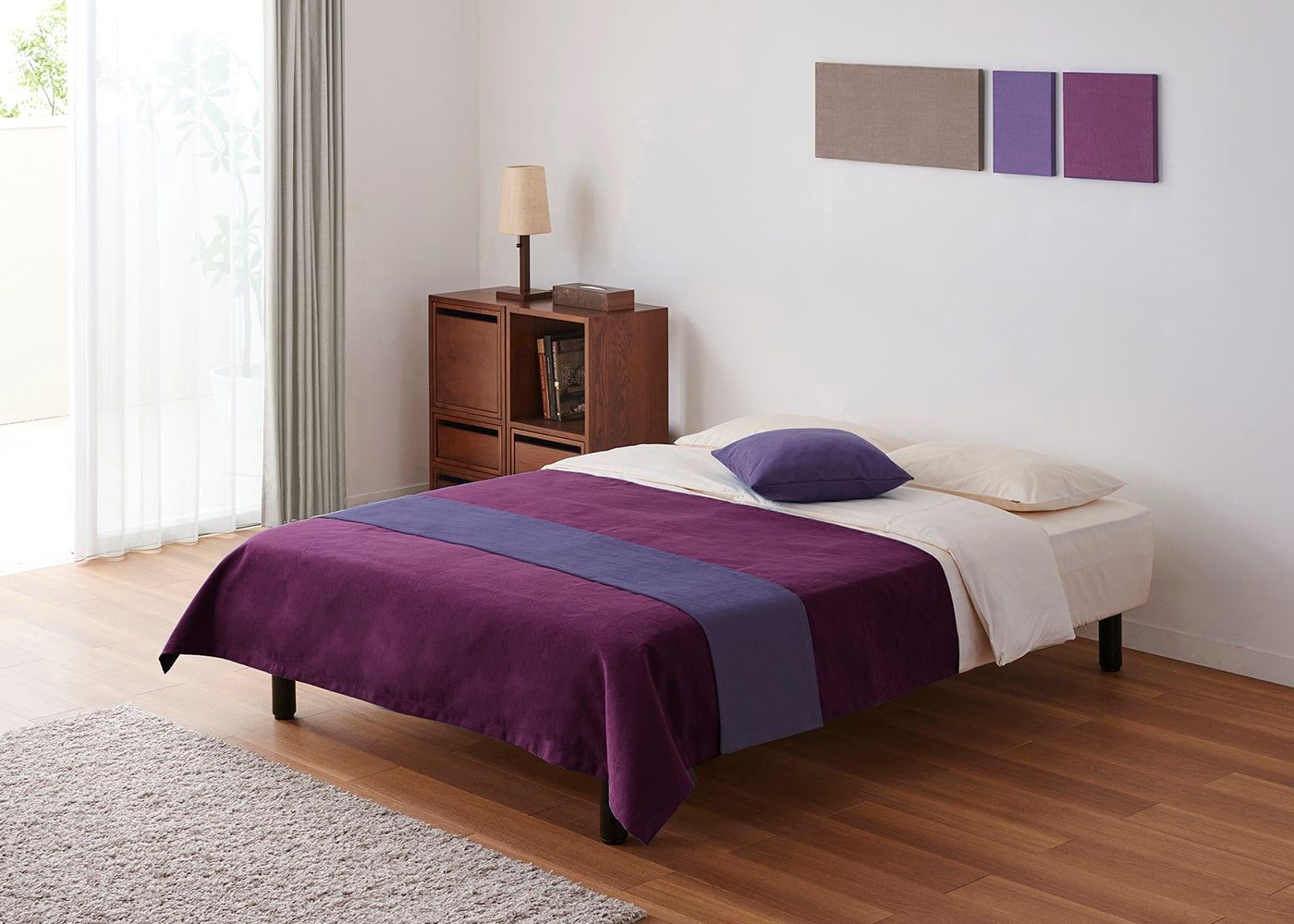 HBパープルのセット例。ベッドスプレッドがベッド全体を覆えるサイズになるため、生活感を軽減したりマットレスや寝具を埃から守ってくれます。