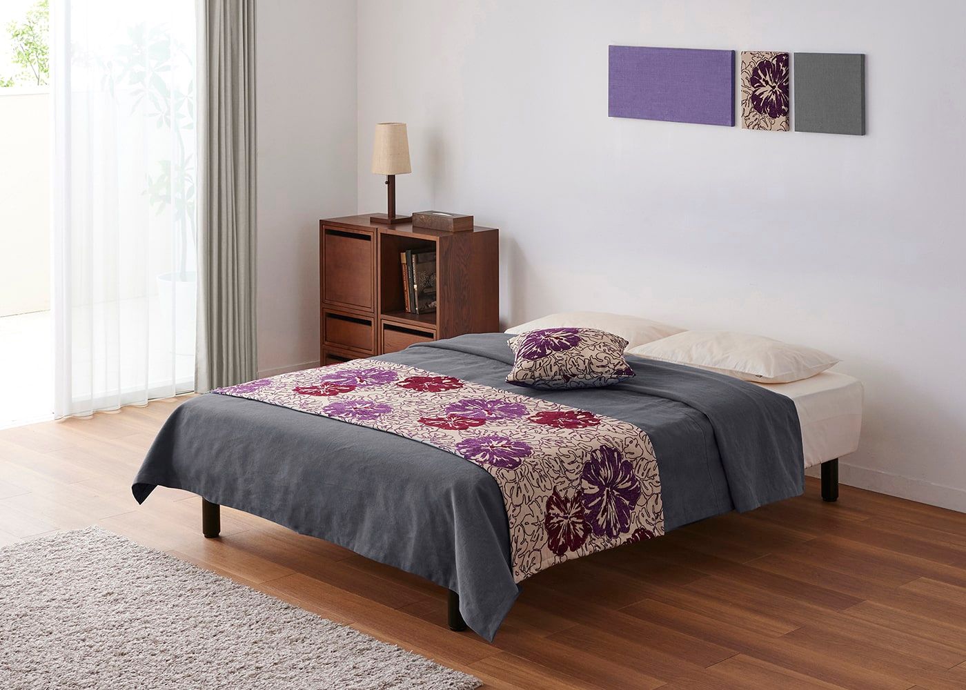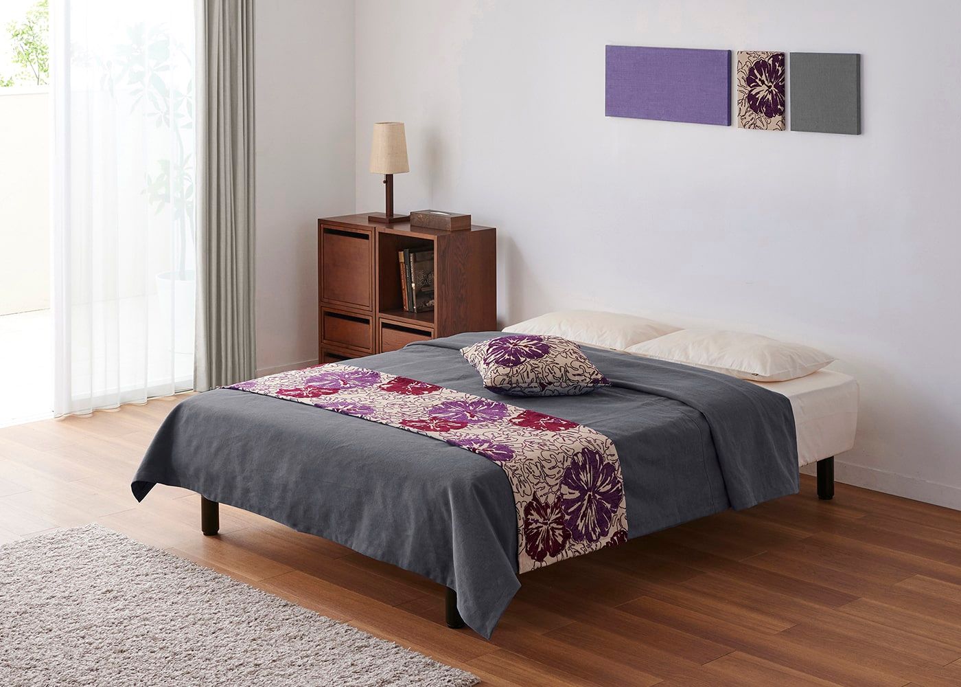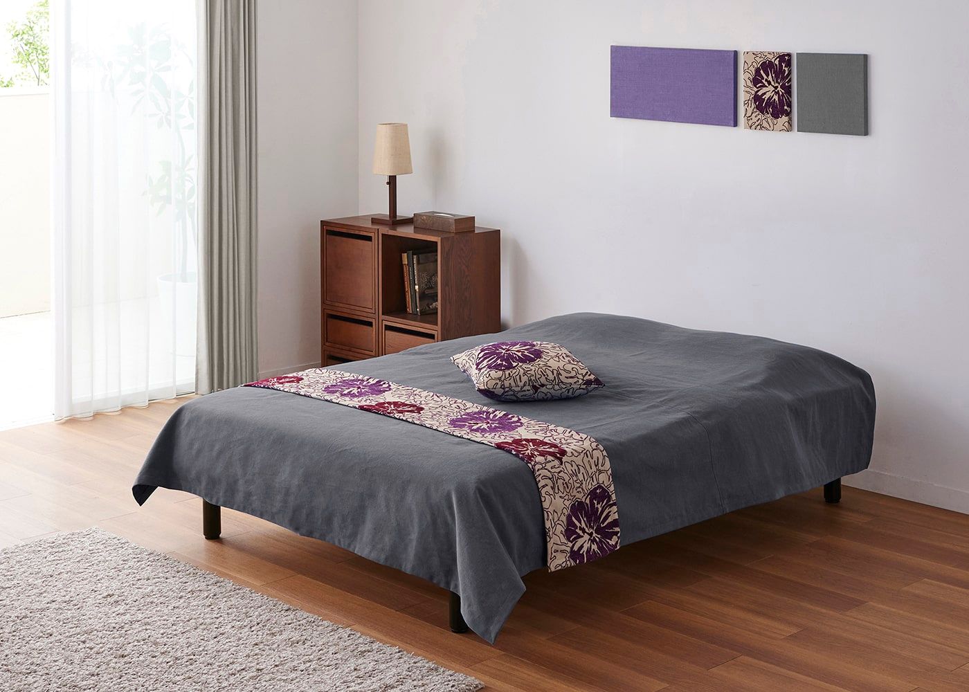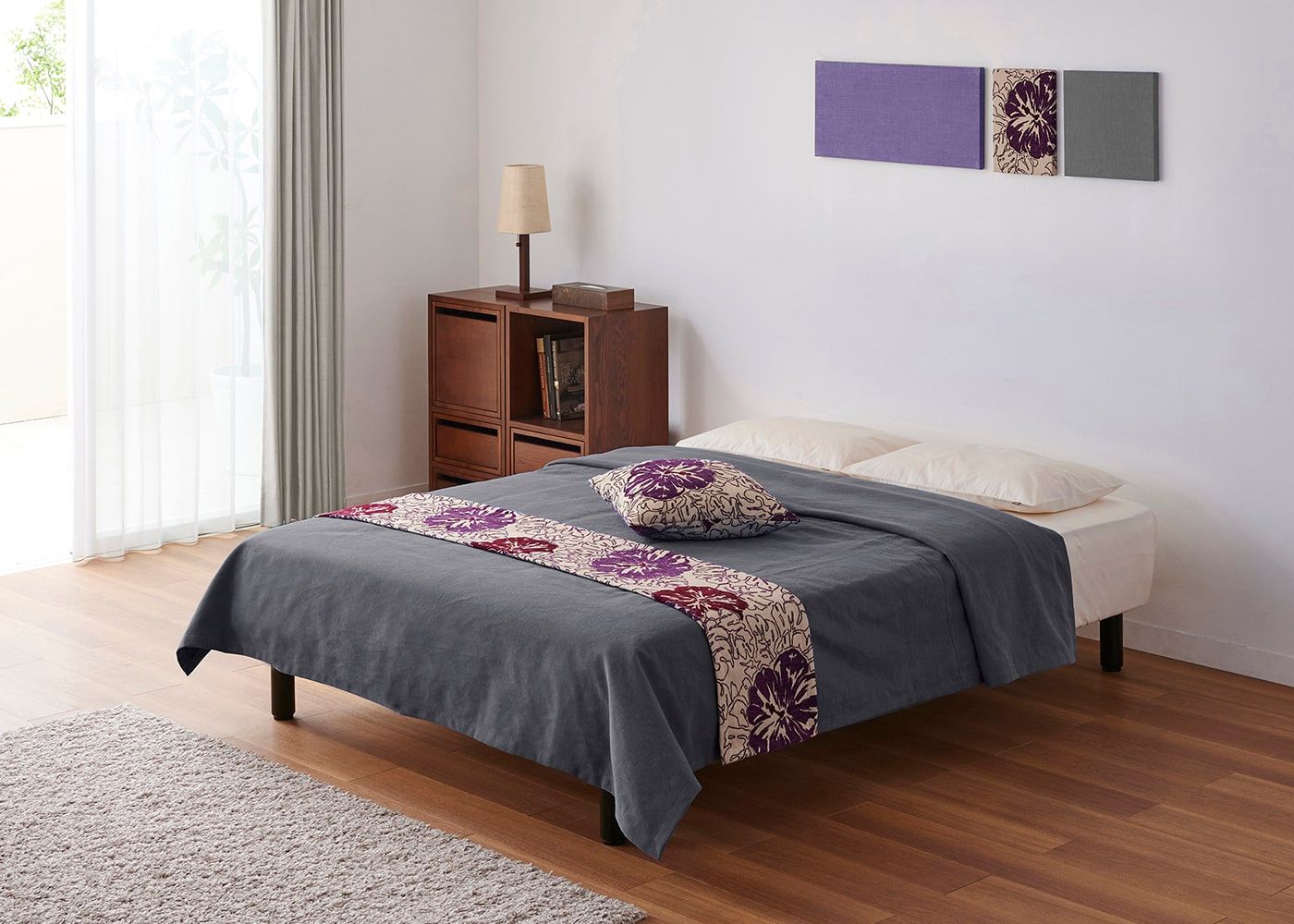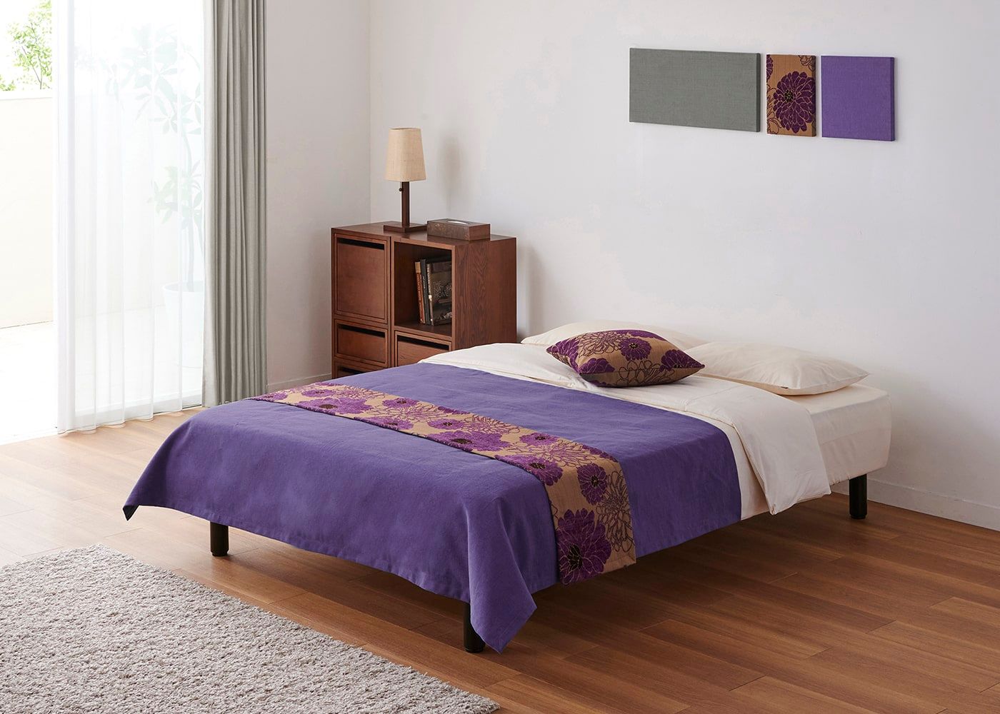 HBパープルのセット例。ベッドスローが細身のためさりげないアクセントがプラスできます。同じ生地の壁面装飾を取り入れたり、相性のよいラグ・カーテンを合わせて自分だけの寝室を作り上げてみましょう。