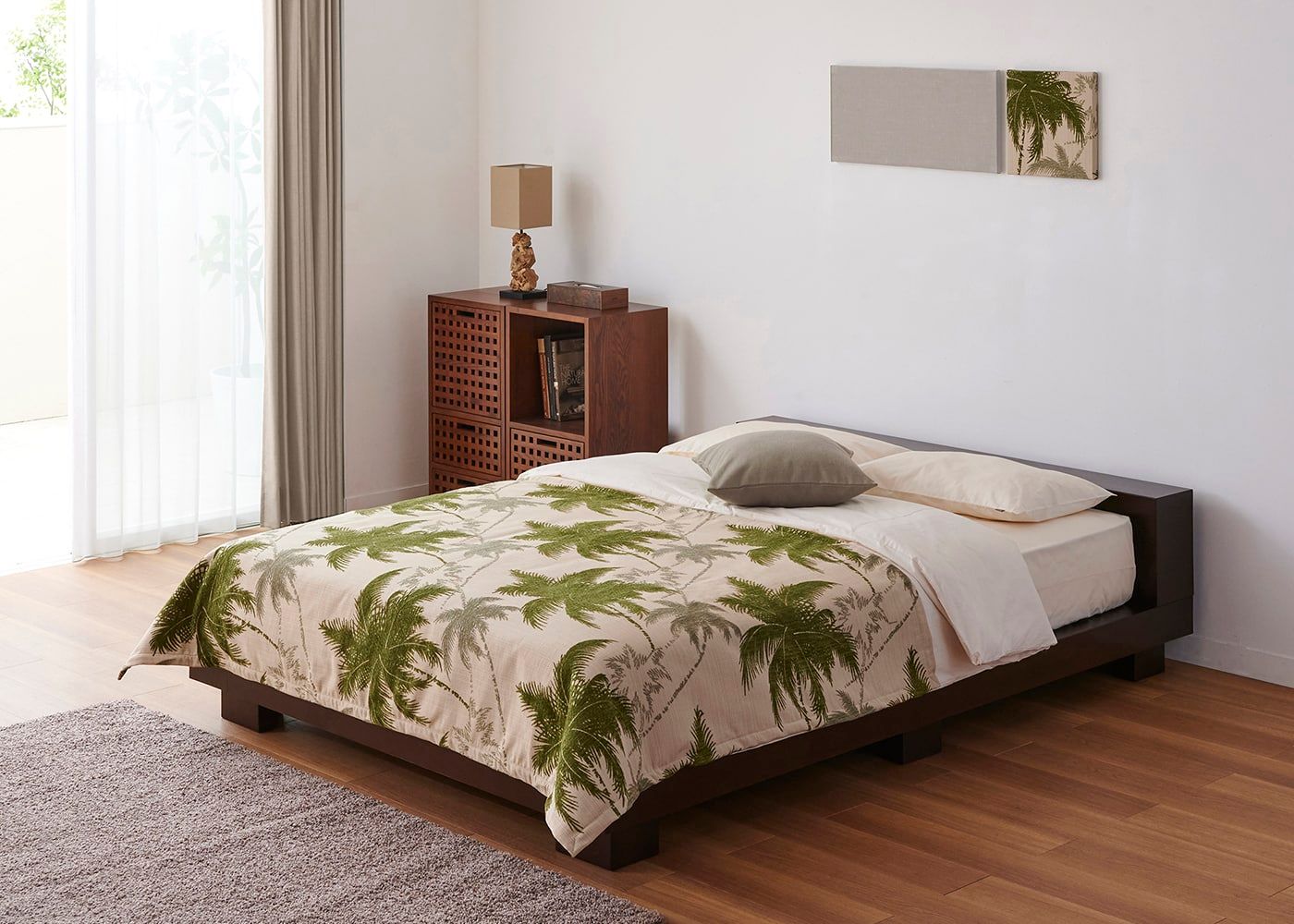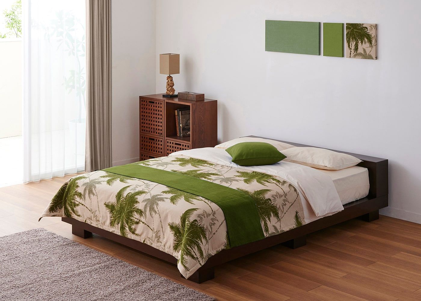 ここからは、ベッドスプレッド (パーム)に多彩な寝室インテリアをプラスした組み合わせ例をご紹介。理想の寝室づくりの参考にしてください。(写真はベッドスプレッド 奥行1300 PRグリーンと、ベッドスロー 奥行300