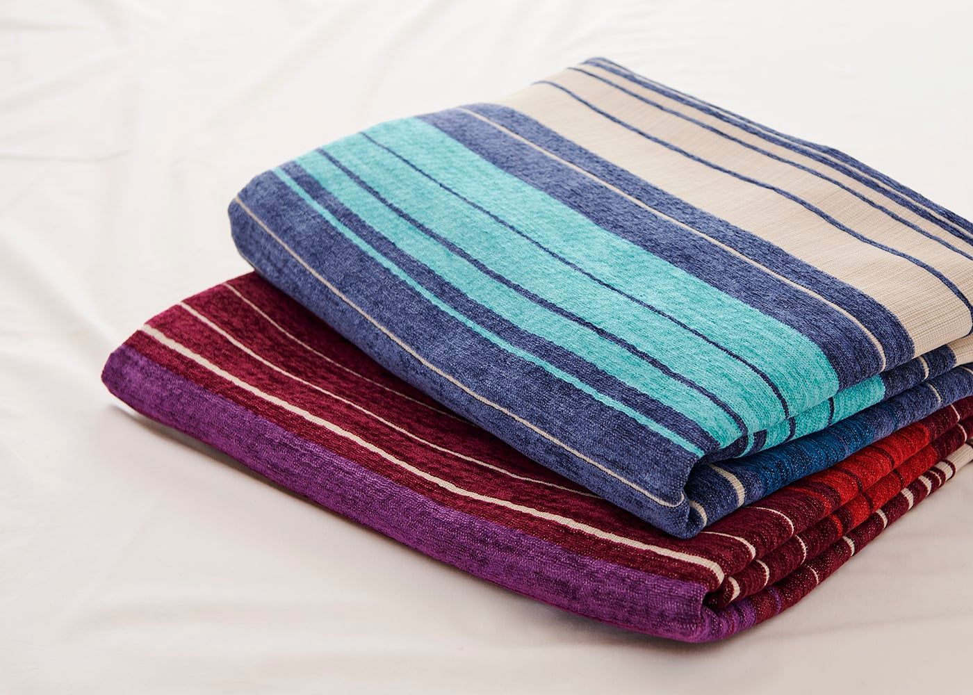 パープルは島々の黄昏時の海辺を連想させる、色鮮やかなグラデーションが魅力です。色とりどりのパープルやレッドをランダムの線で描いたボーダー柄のベッドスローは、自宅にリゾートムードを演出してくれるでしょう。(写真はILパープル)