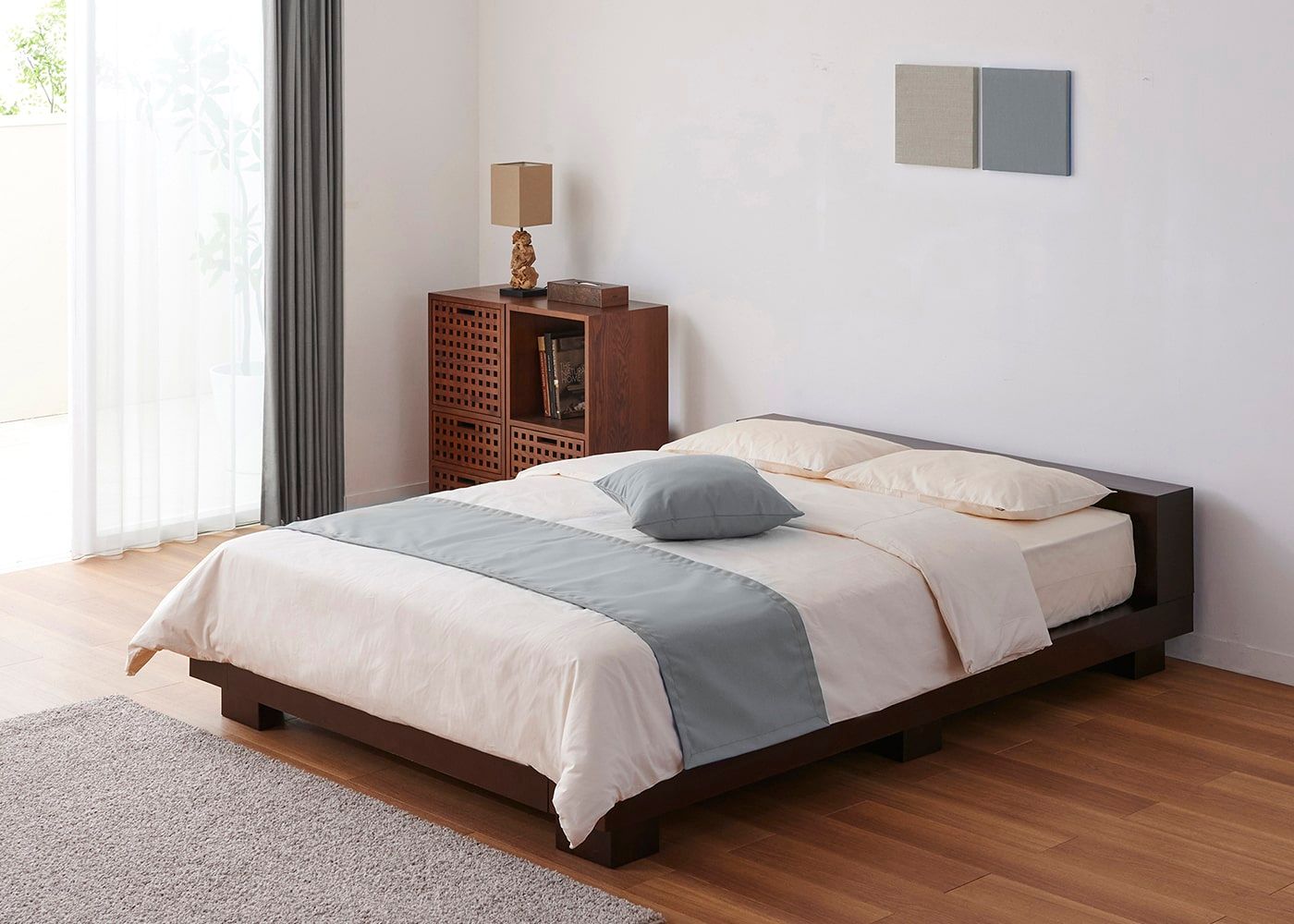 寝室のコーディネートや模様替えをこだわりたい時は、ベッドスプレッド(別売り)と組み合わせてみては? 2枚でコーディネートすることで、おしゃれでホテルライクな部屋づくりが叶います。(写真はベッドスプレッド 奥行1300