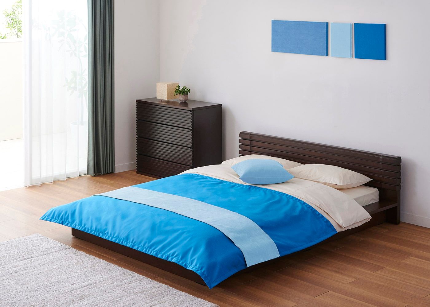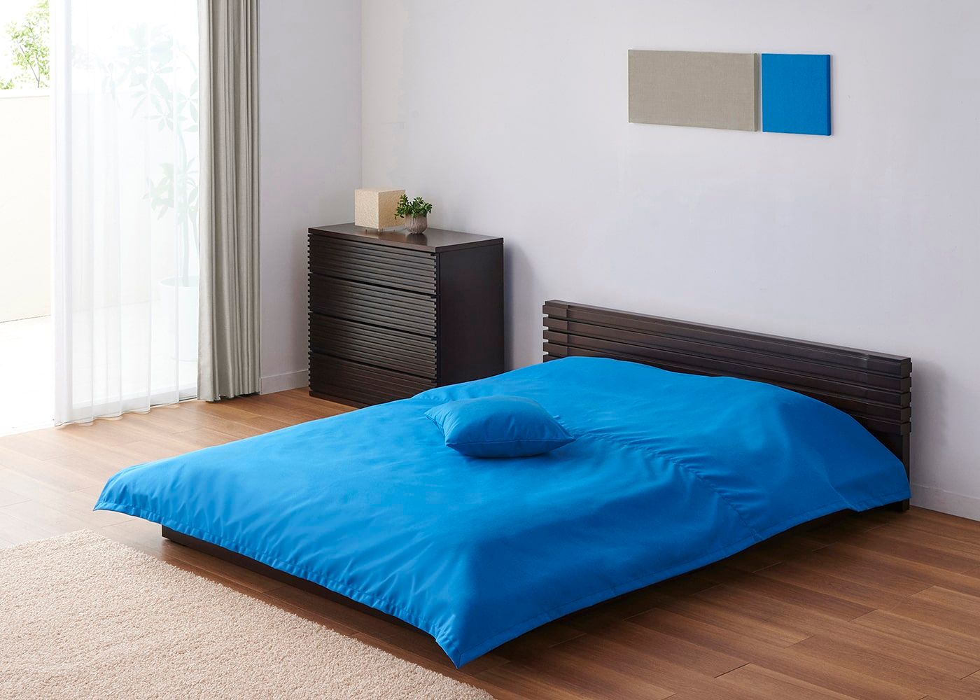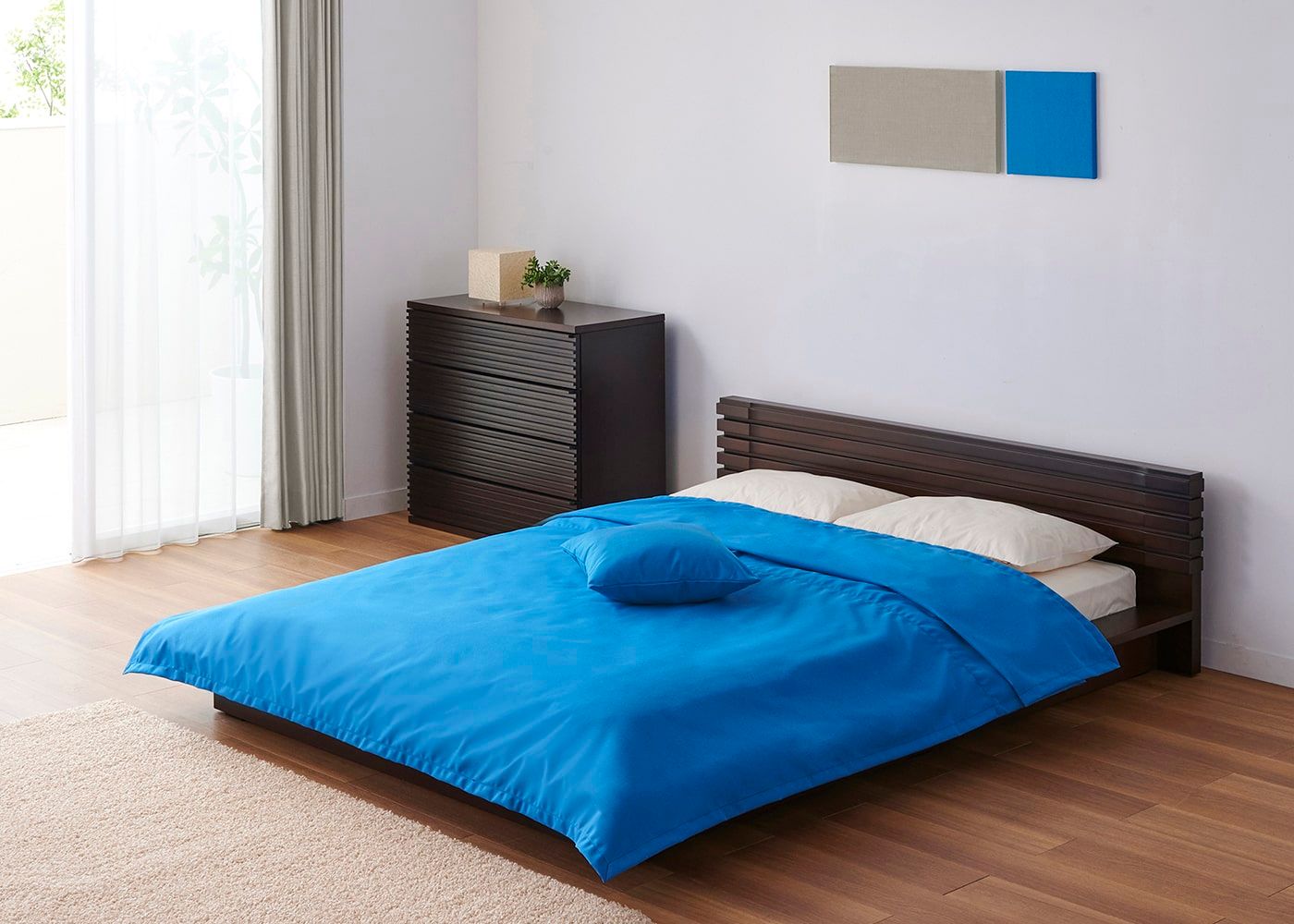 寝室のコーディネートや模様替えをこだわりたい時は、足元にベッドスロー(別売り)も添えてみては? 組み合わせて使うことで、おしゃれでホテルライクな部屋づくりが叶います。(写真はベッドスプレッド 奥行1300 TPブルーと、ベッドスロー 奥行300 CLアクアのセット例)