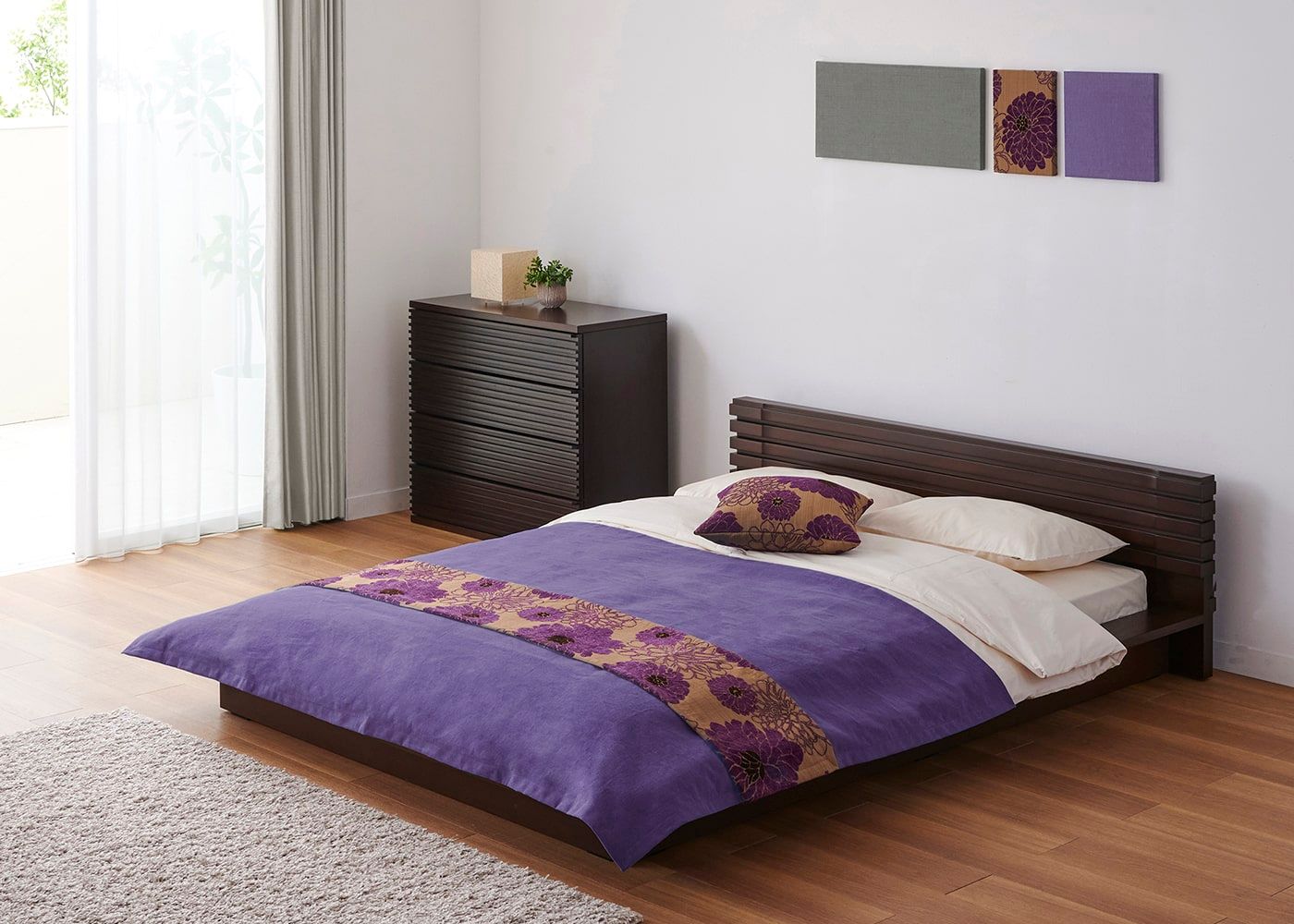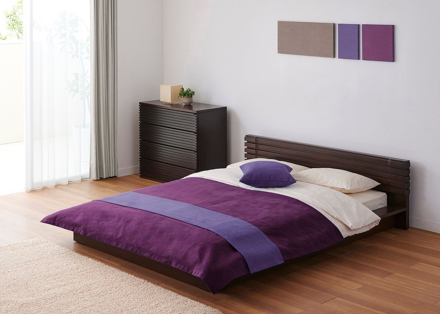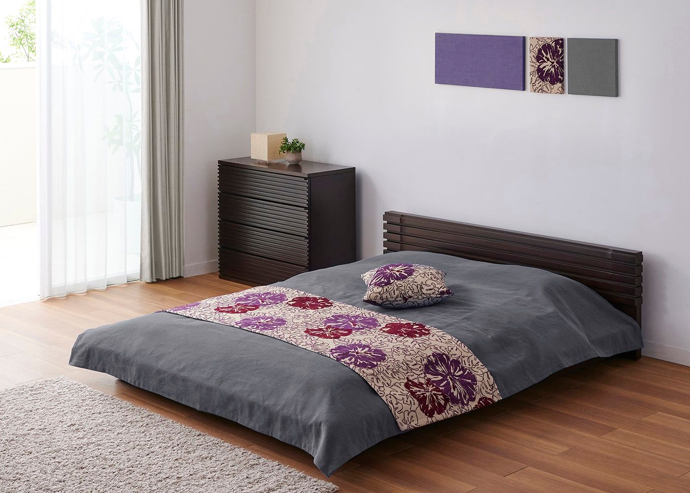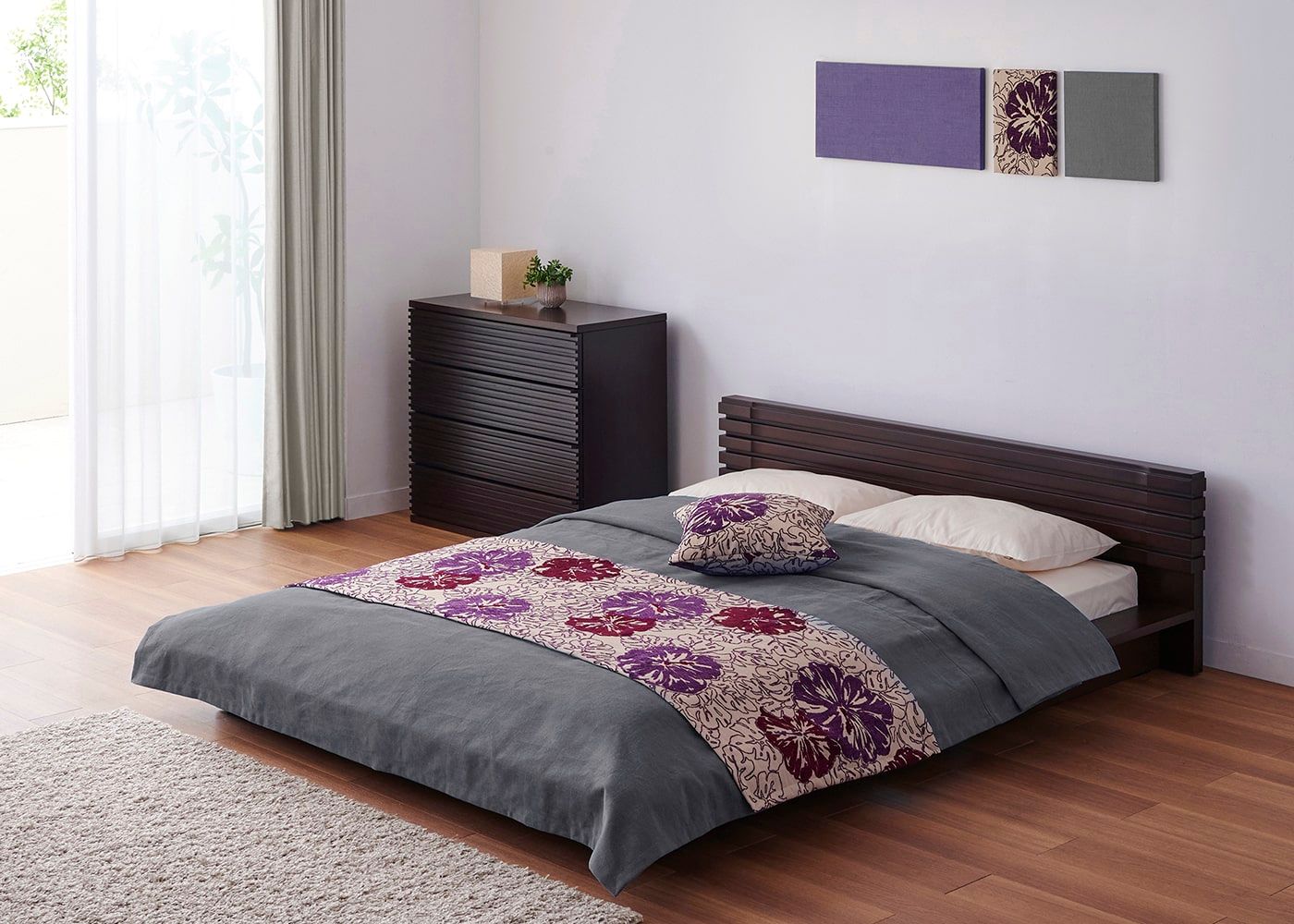 HBパープルのセット例。ベッドスローが細身のためさりげないアクセントがプラスできます。同じ生地の壁面装飾を取り入れたり、相性のよいラグ・カーテンを合わせて自分だけの寝室を作り上げてみましょう。