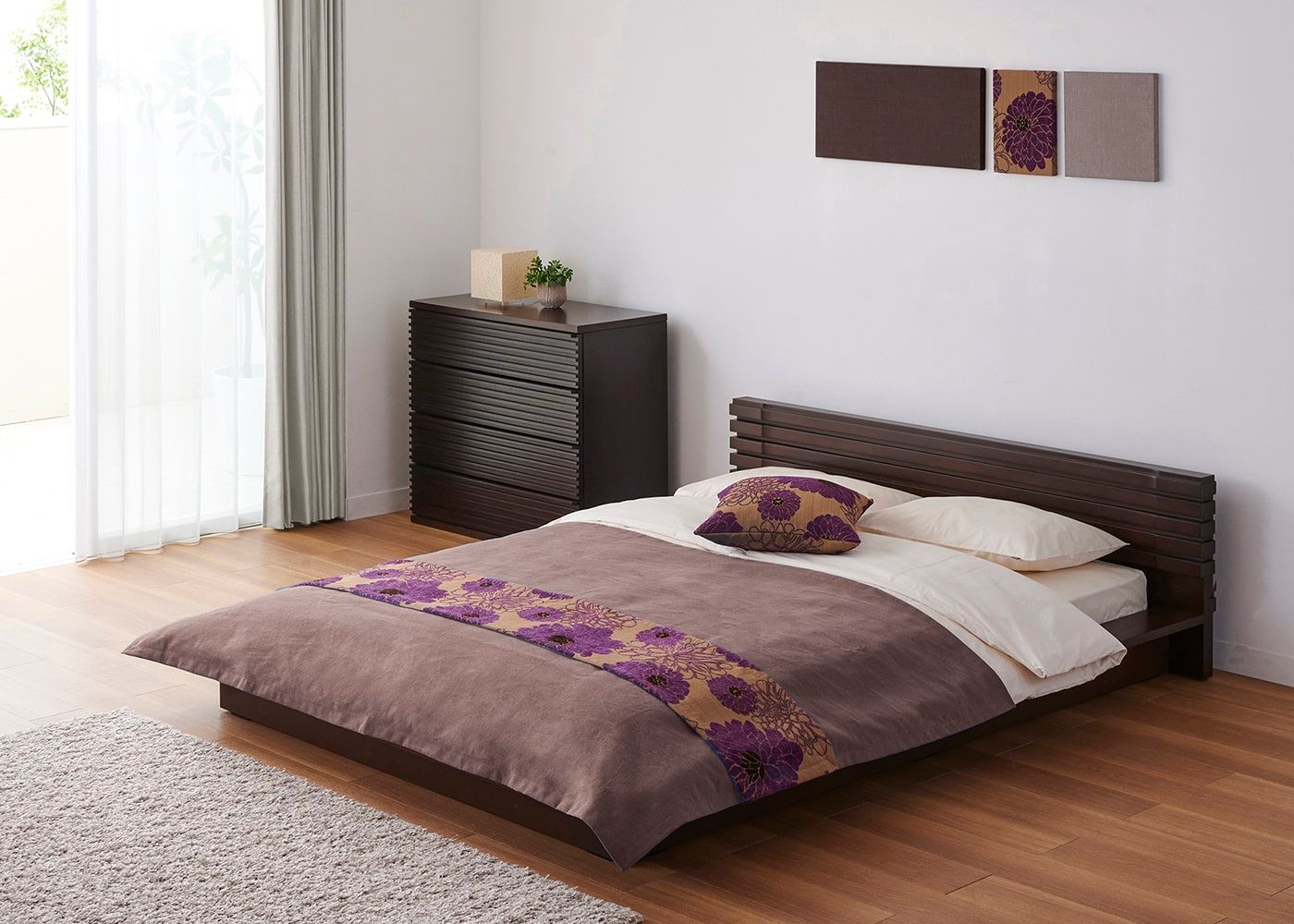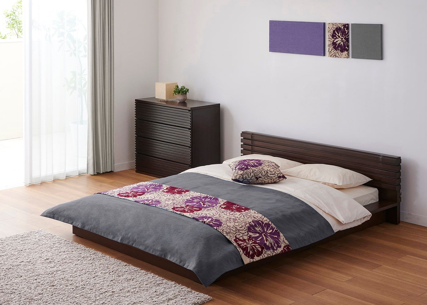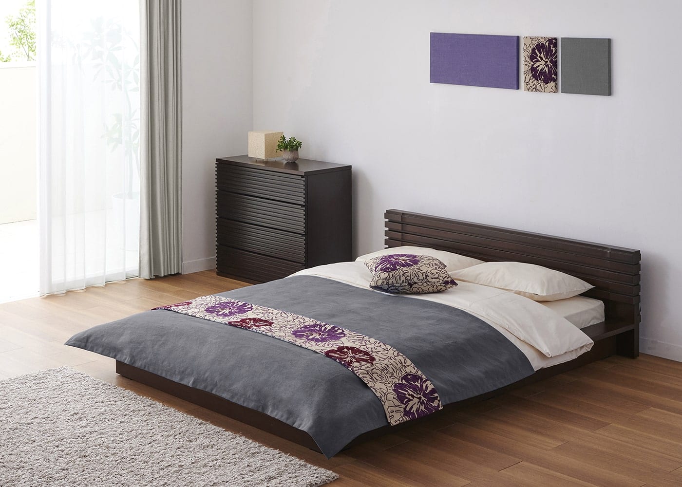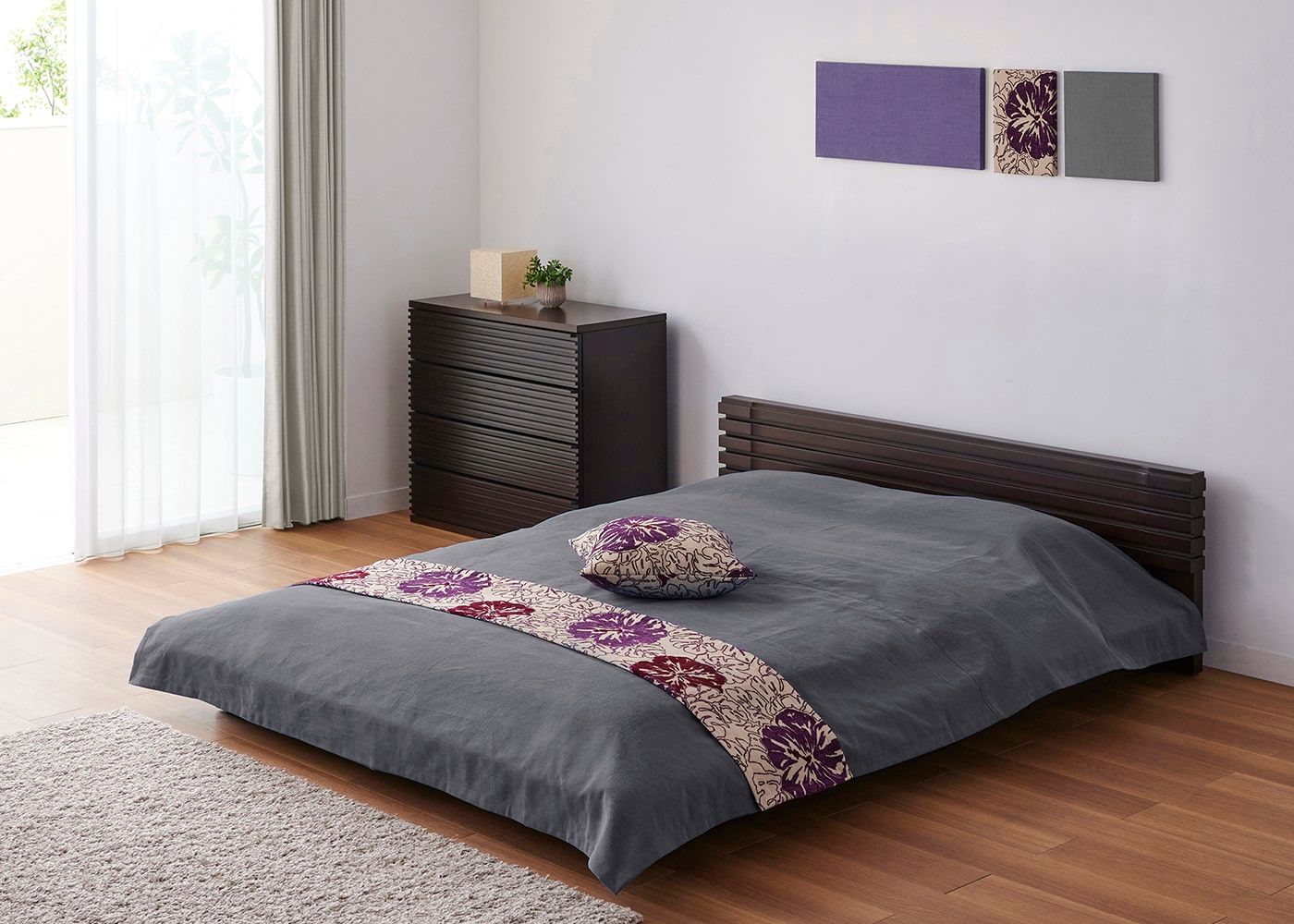 HBパープルのセット例。ベッドスローが細身のためさりげないアクセントがプラスできます。同じ生地の壁面装飾を取り入れたり、相性のよいラグ・カーテンを合わせて自分だけの寝室を作り上げてみましょう。
