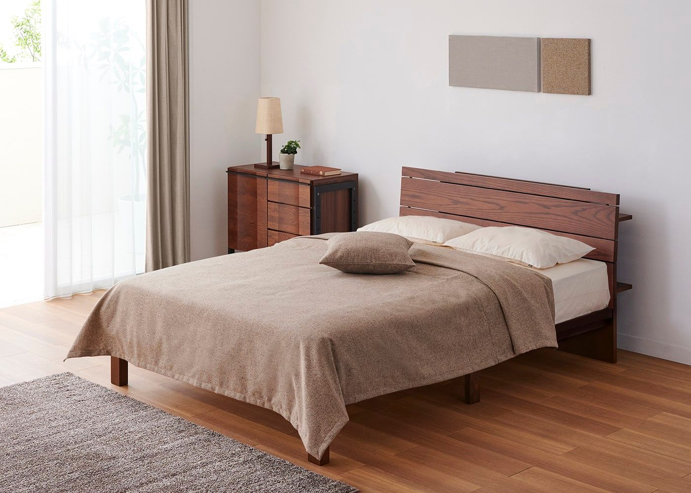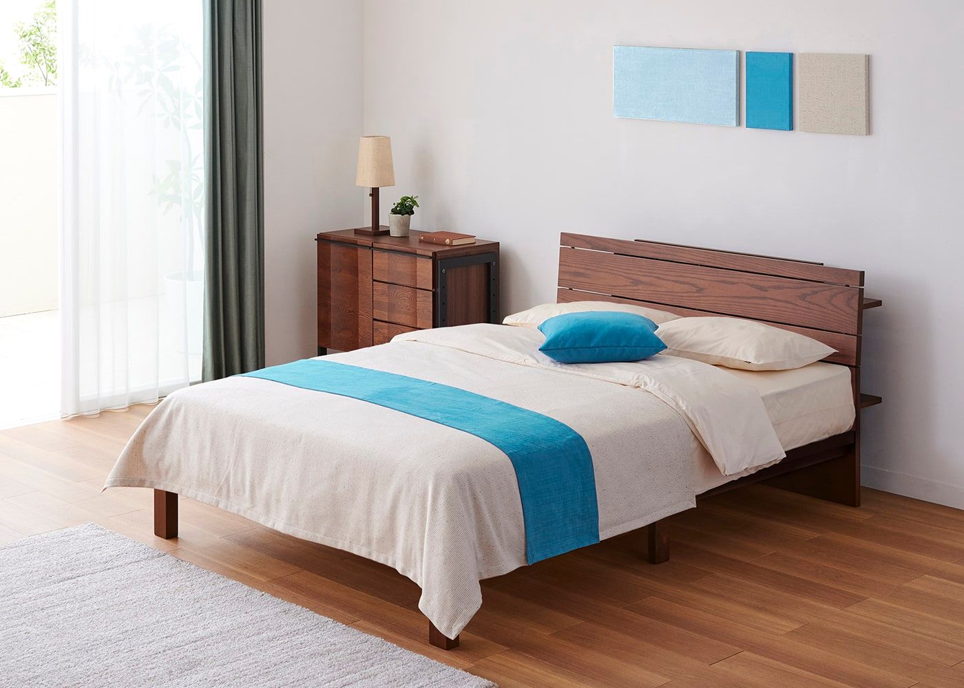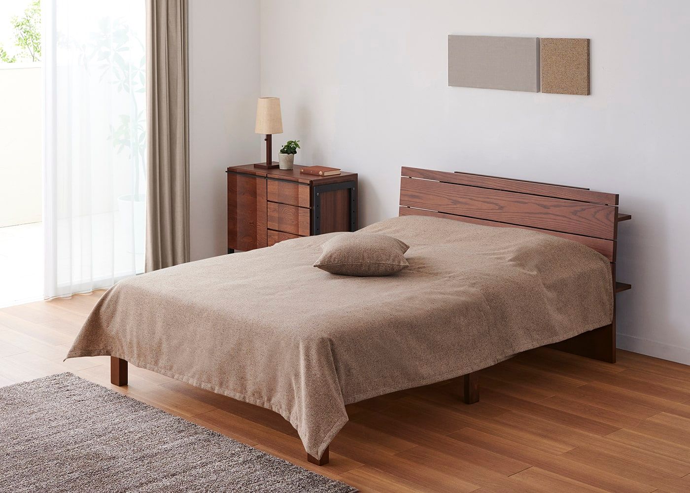 ベッドスプレッドは布団の上に1枚掛けておくことで、保温効果も期待できます。肌寒い季節には環境に応じてプラスしてみましょう。(写真はダブル・奥行1300 PLダークブラウン)