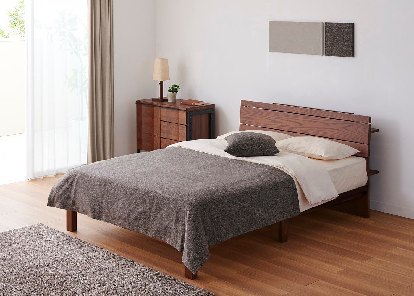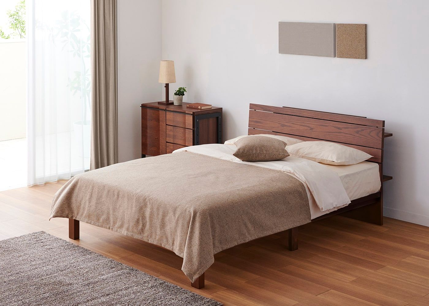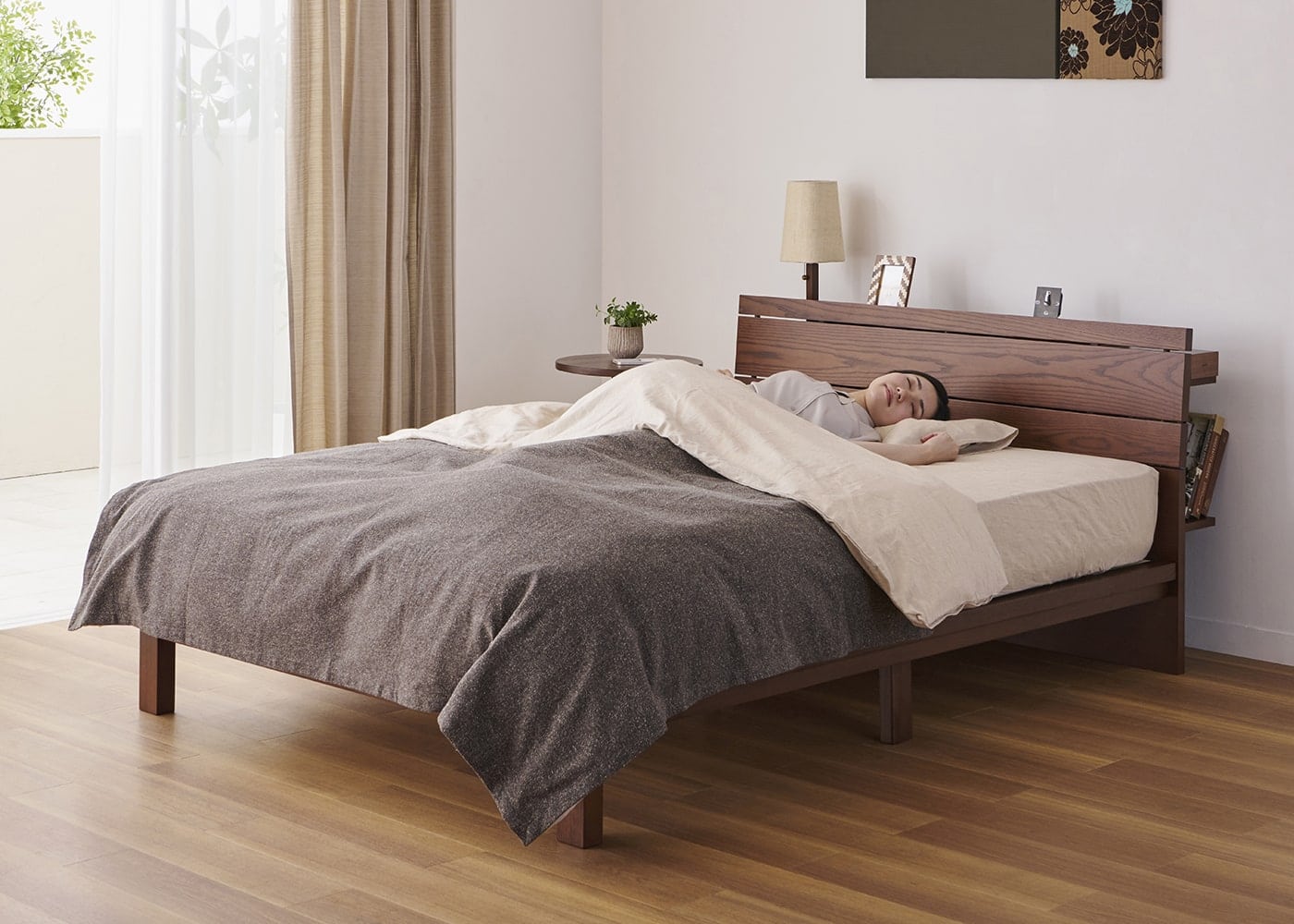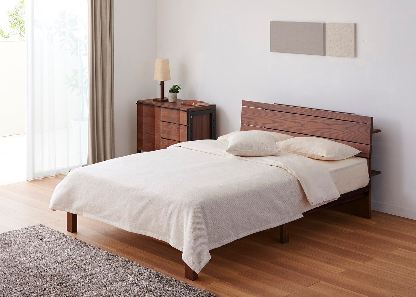 ベッドスプレッドは布団の上に1枚掛けておくことで、保温効果も期待できます。肌寒い季節には環境に応じてプラスしてみましょう。(写真はダブル・奥行1300 PLダークブラウン)