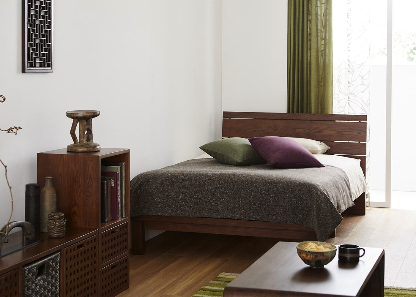 大人っぽい雰囲気のアジアンテイストに仕上げたコーディネート例。落ち着いたブラウンベースに、アクセントになるグリーンやパープルを添えれば、洗練されたリゾート空間を実現できます。(写真はPLダークブラウン。クッションは左から