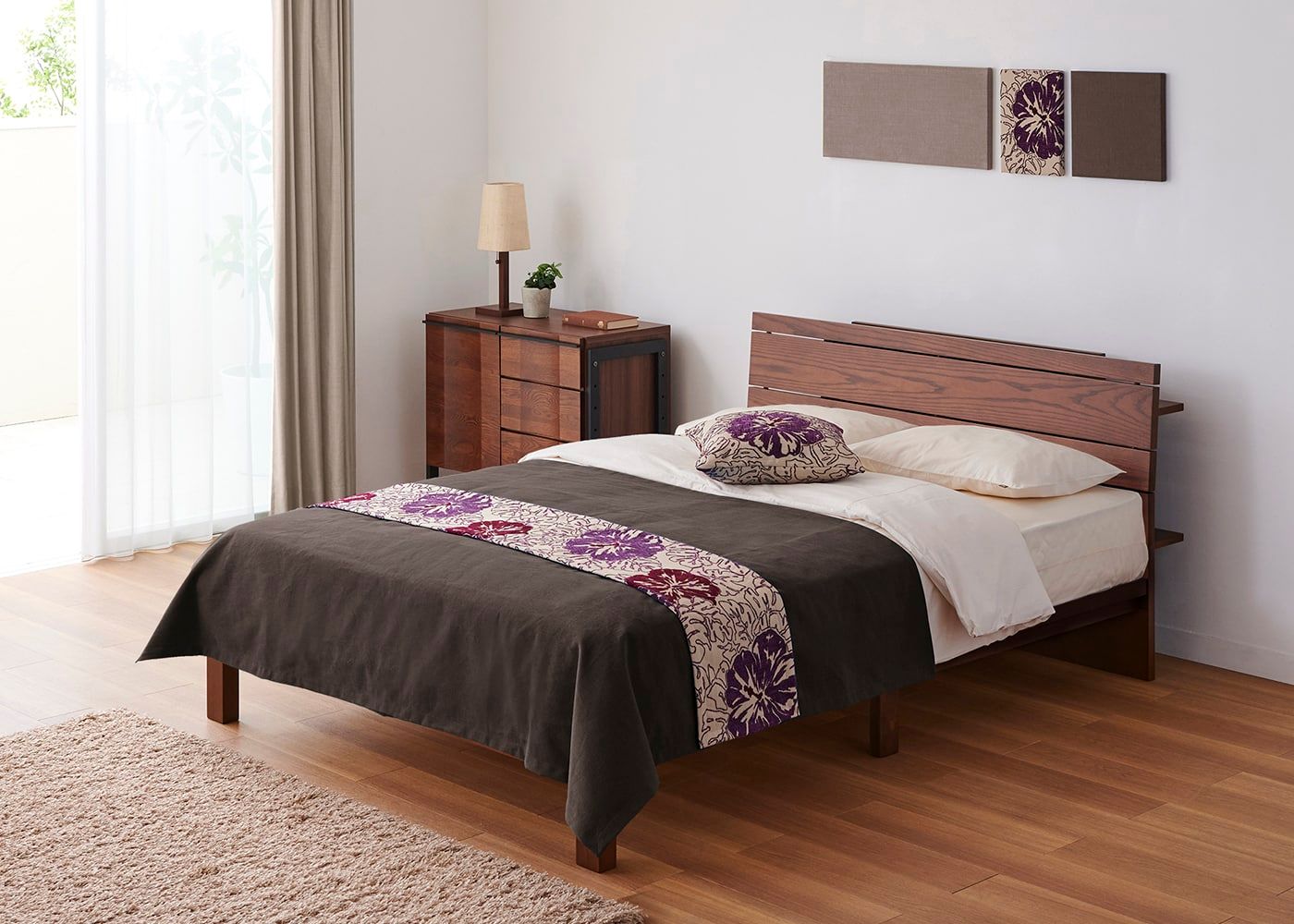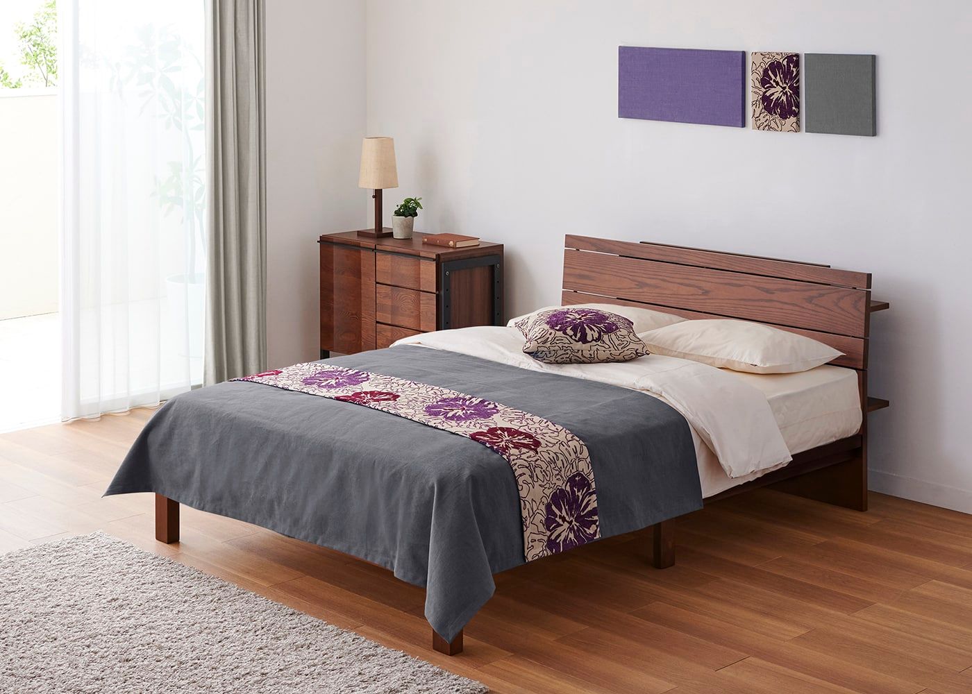 寝室のコーディネートや模様替えをこだわりたい時は、ベッドスプレッド(別売り)と組み合わせてみては? 2枚でコーディネートすることで、おしゃれでホテルライクな部屋づくりが叶います。(写真はベッドスプレッド 奥行1300 CLチョコレートと、ベッドスロー 奥行300 HBパープルのセット例)