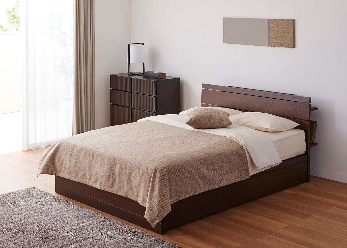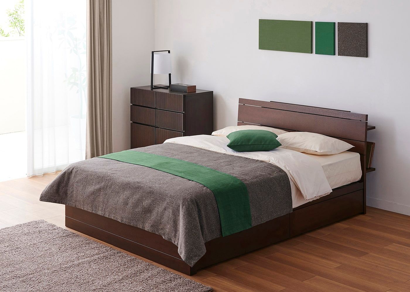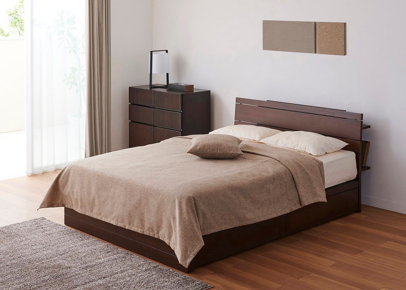 奥行1300 PLダークブラウンと、ベッドスロー 奥行300