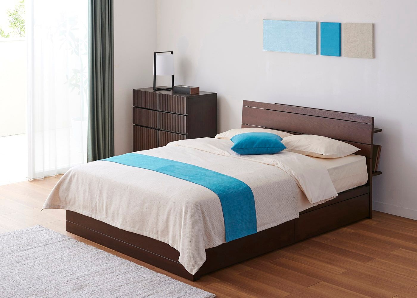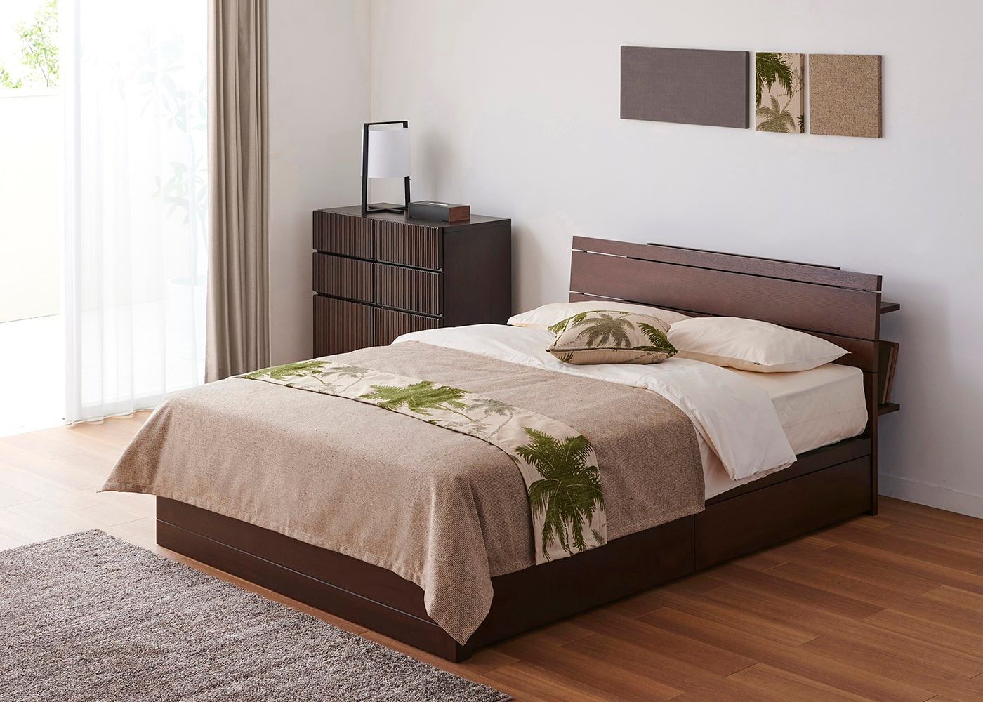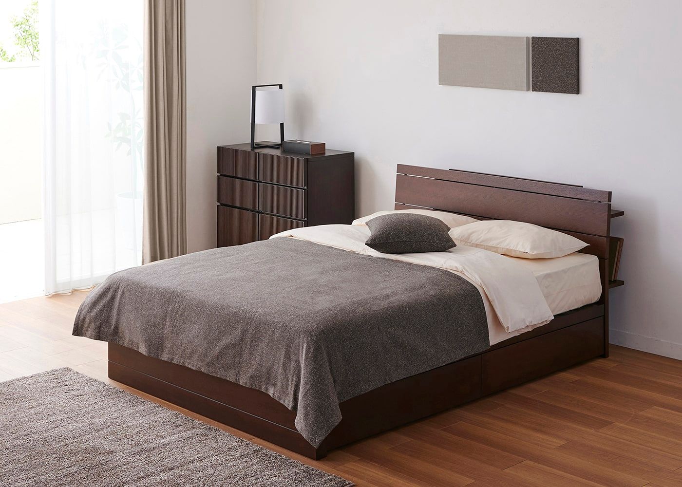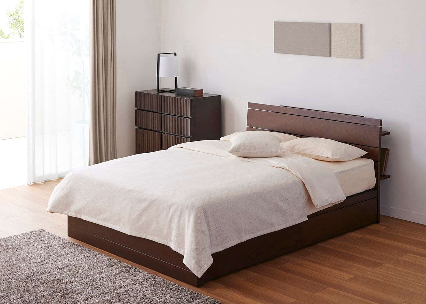 奥行1300 PLダークブラウンと、ベッドスロー 奥行300